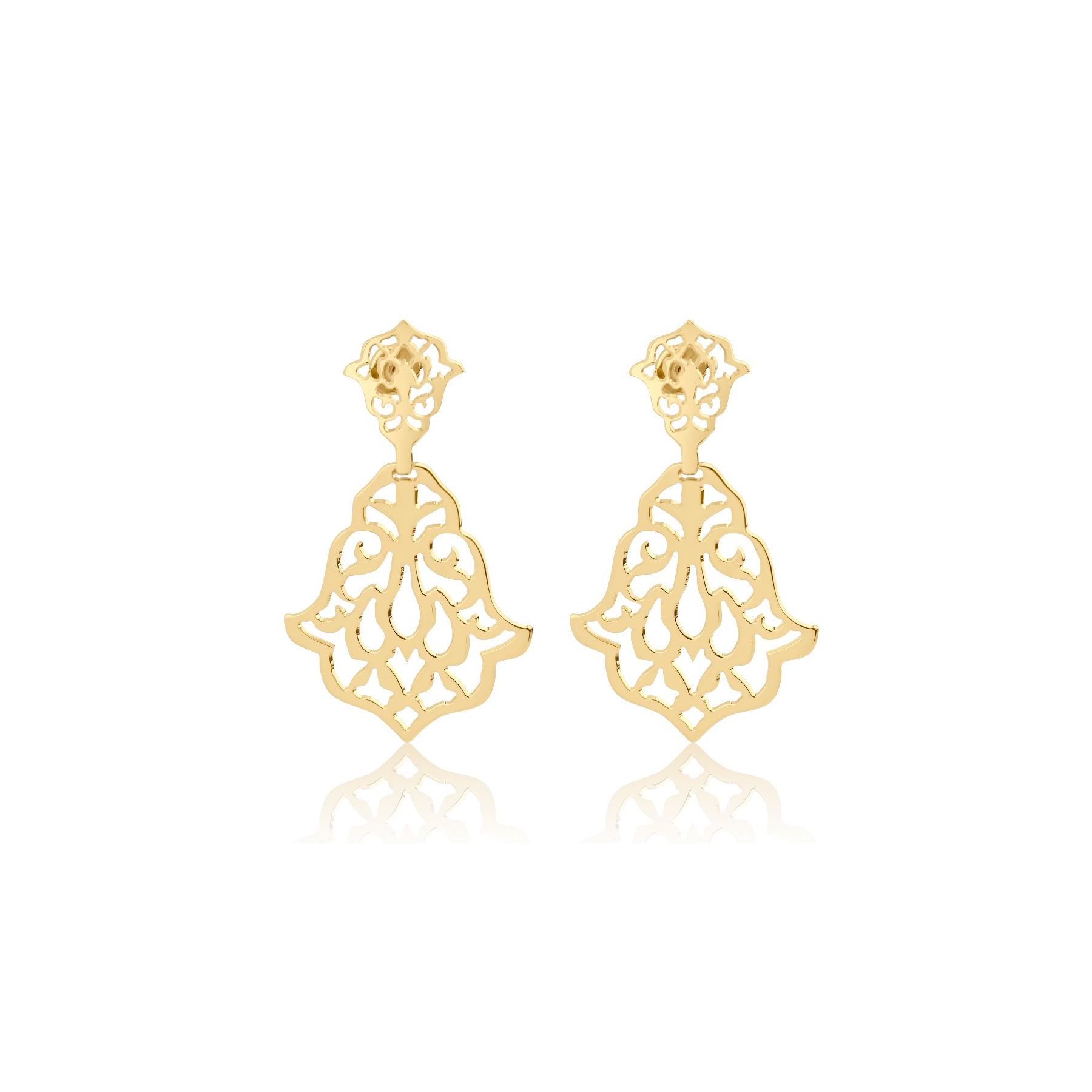 Ce modèle de créoles en plaqué or 18K incarne l'excellence artisanale avec ses courbes harmonieuses et son éclat doré lumineux. Les Boucles Khmissa Excellence sont bien plus que de simples accessoires : elles sont le reflet d'un style raffiné et intemporel. Leur design ajouré laisse jouer la lumière pour un effet particulièrement féminin et distingué.