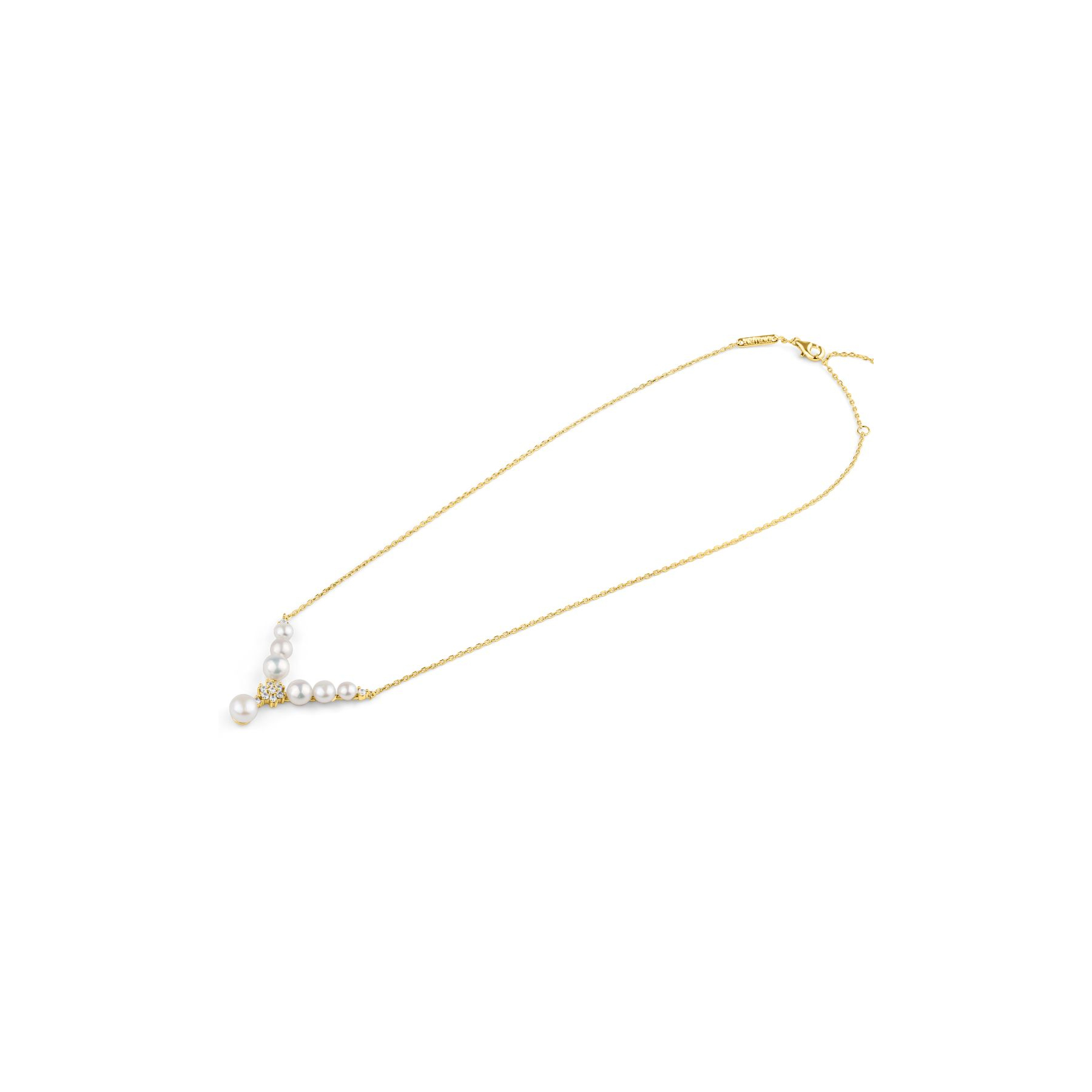 Sept perles de culture d’eau douce viennent compléter l’ensemble, apportant douceur et raffinement à ce bijou féminin. Leur disposition équilibrée et la finesse de la chaîne mettent en valeur la beauté naturelle des perles. Le collier s’ajuste grâce à trois longueurs possibles : 390 mm, 420 mm et 450 mm, permettant de l’adapter à différentes morphologies et styles de tenues.