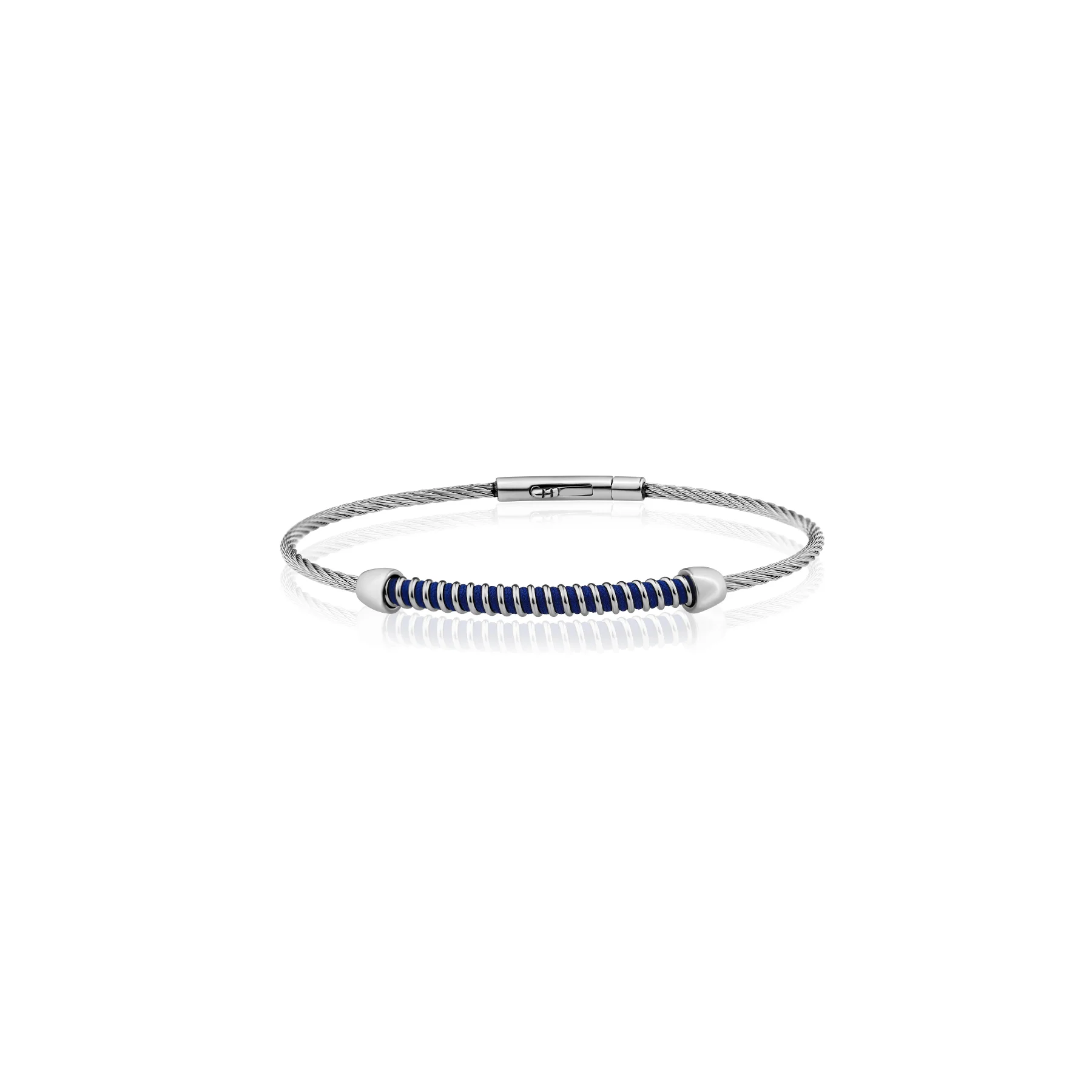 Fabriqué en Acier 316L, un matériau réputé pour sa résistance à la corrosion et son éclat durable, ce bracelet rigide se distingue par son câble gris sophistiqué et sa pièce centrale bleue qui apporte une touche d’originalité. Avec un diamètre intérieur de 65 x 52 mm, il s’adapte parfaitement au poignet pour un confort optimal.