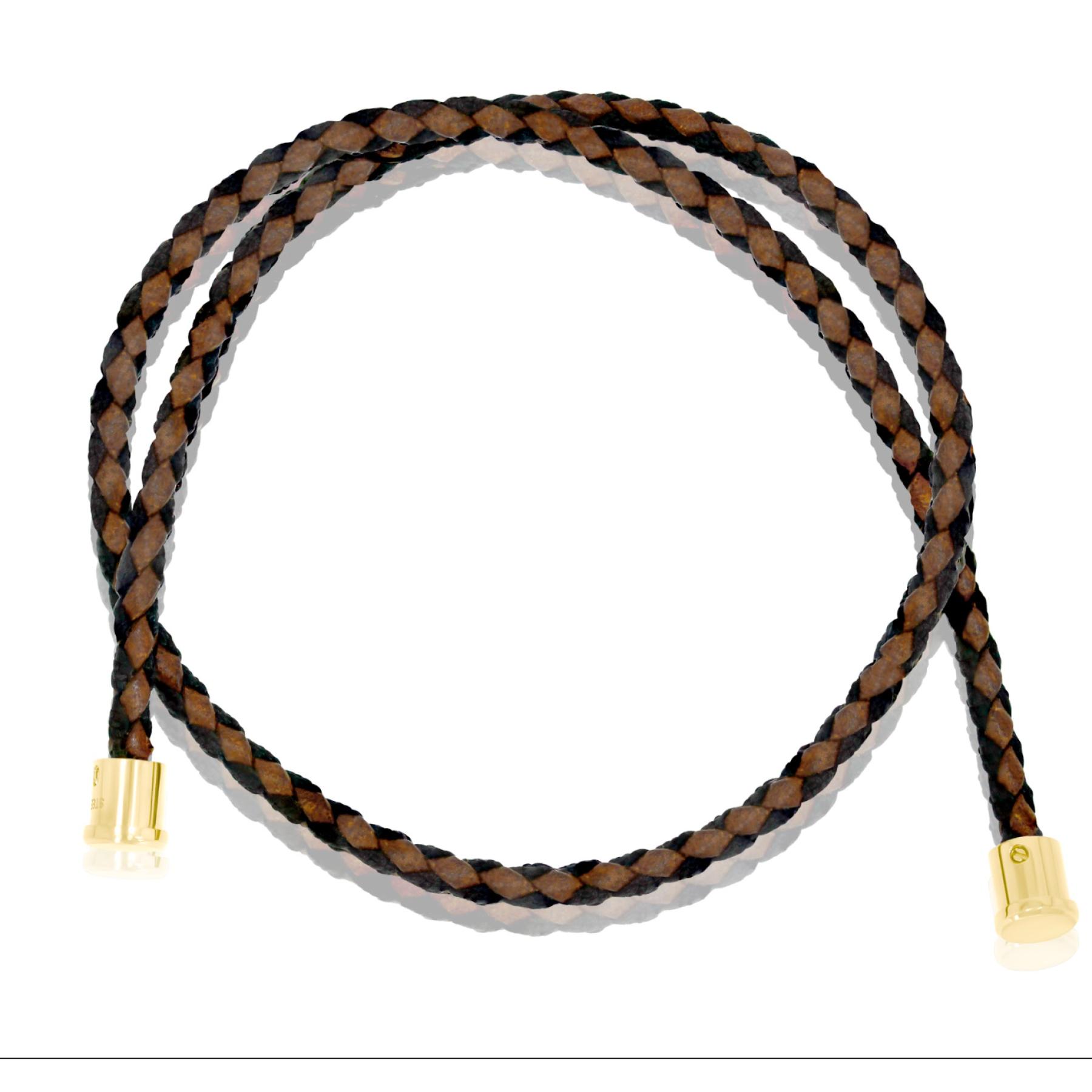 UnisexeLanière double tour en cuir & cotton tressé en marron foncé & noir, qualité Italienne, épaisseur du cuir 3mm, avec embouts en Acier W 316L PVD rose inoxydable.