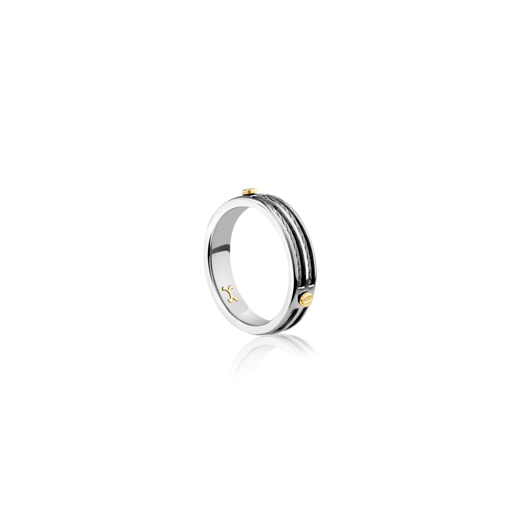 Avec sa largeur de 5 mm, cette bague se distingue par un design moderne et original. Deux câbles gris sont finement encastrés dans l’anneau, maintenus par trois clous en Or 18K. Ce contraste entre les textures métalliques crée un effet visuel fort et structuré, tout en conservant une finesse adaptée à un bijou quotidien ou cérémonial.