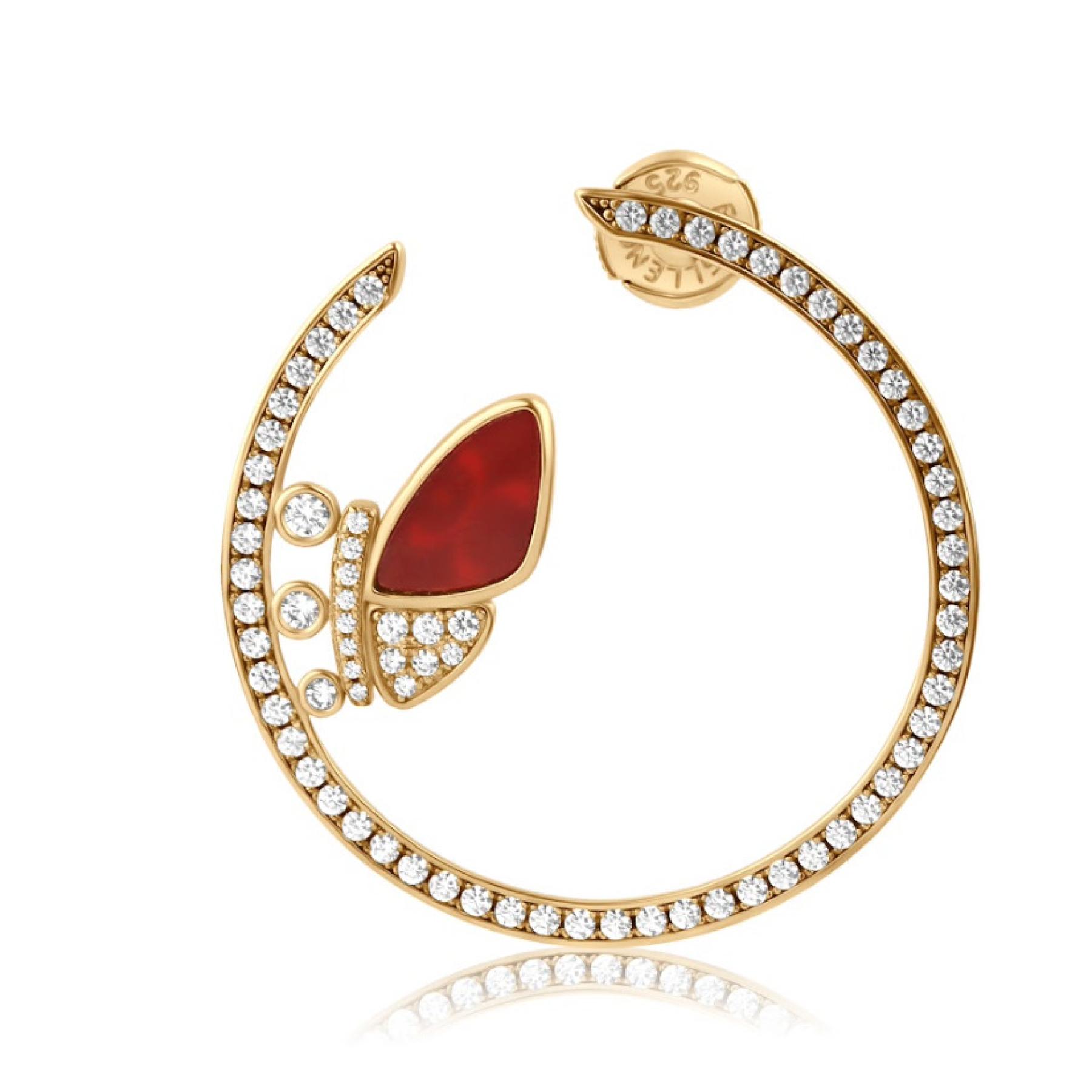 FEMMECréole Papillon en Plaqué Or 18K 3Mic, ornées de Grenat, et serti de zirconiums blancs. Diamètre de la boucle 35 mm. Dimensions du motif 17 x 10 mm.