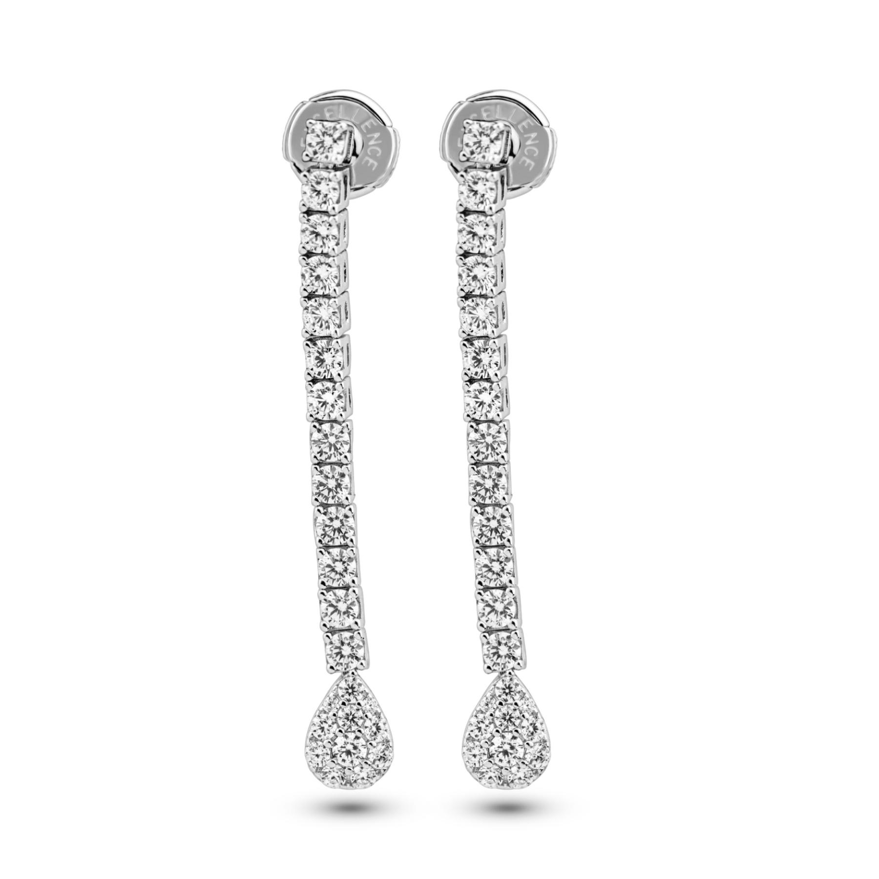 Boucles Rivière Excellence en Argent 925 Rhodié, avec poire pendante, le tout serti de zirconiums blancs. Longueur totale de la boucle 44 mm, dimensions du motif 8 x 6 mm.