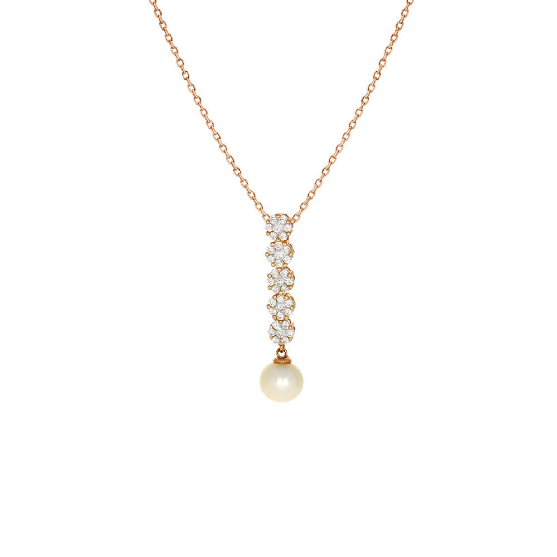 Ce pendentif en argent est soigneusement travaillé pour offrir un équilibre parfait entre finesse et brillance. À son extrémité, une perle de culture d’eau douce de 7,5 mm de diamètre apporte une touche naturelle et précieuse à l’ensemble. Sa teinte nacrée complète harmonieusement la chaleur du plaqué or rose et la clarté des zirconiums.