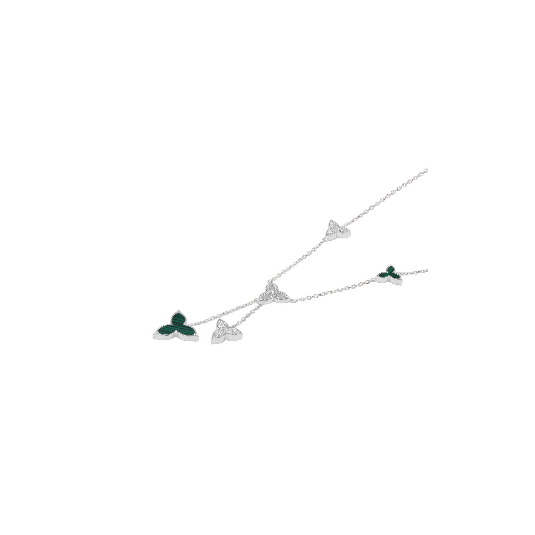 Collier Flower en Argent 925 rhodié, orné de malachite, serti de zirconiums. Taille des motifs, entre 10 et 15 mm. Longueur de la chaîne 420 - 435 - 450 mm.