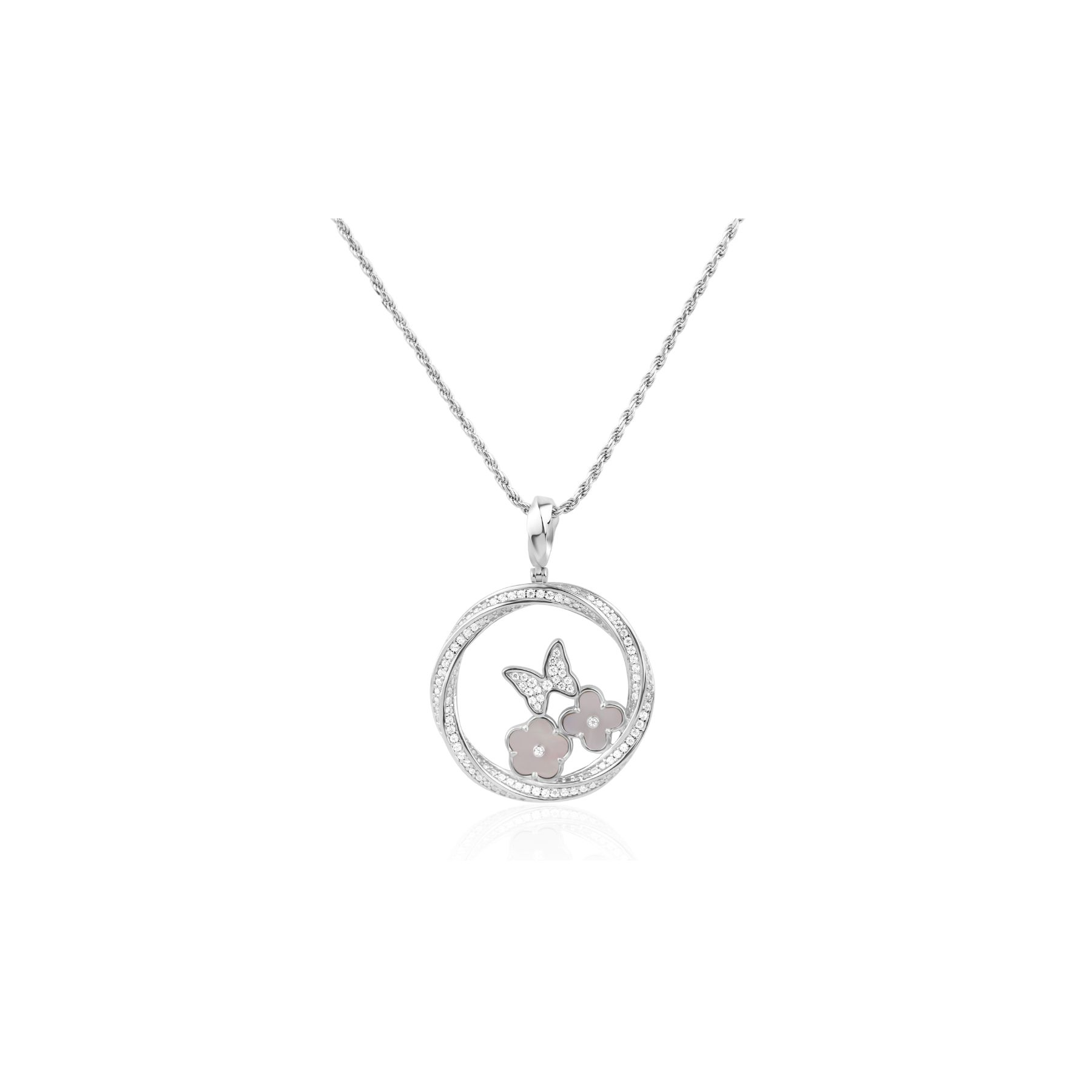 FEMMEPendentif circulaire torsadé en Argent 925 rhodié, orné de 3 motifs, papillon serti de zirconiums, fleur 5 petales et trèfle sertis de nacre. Diamètre 28 mm.