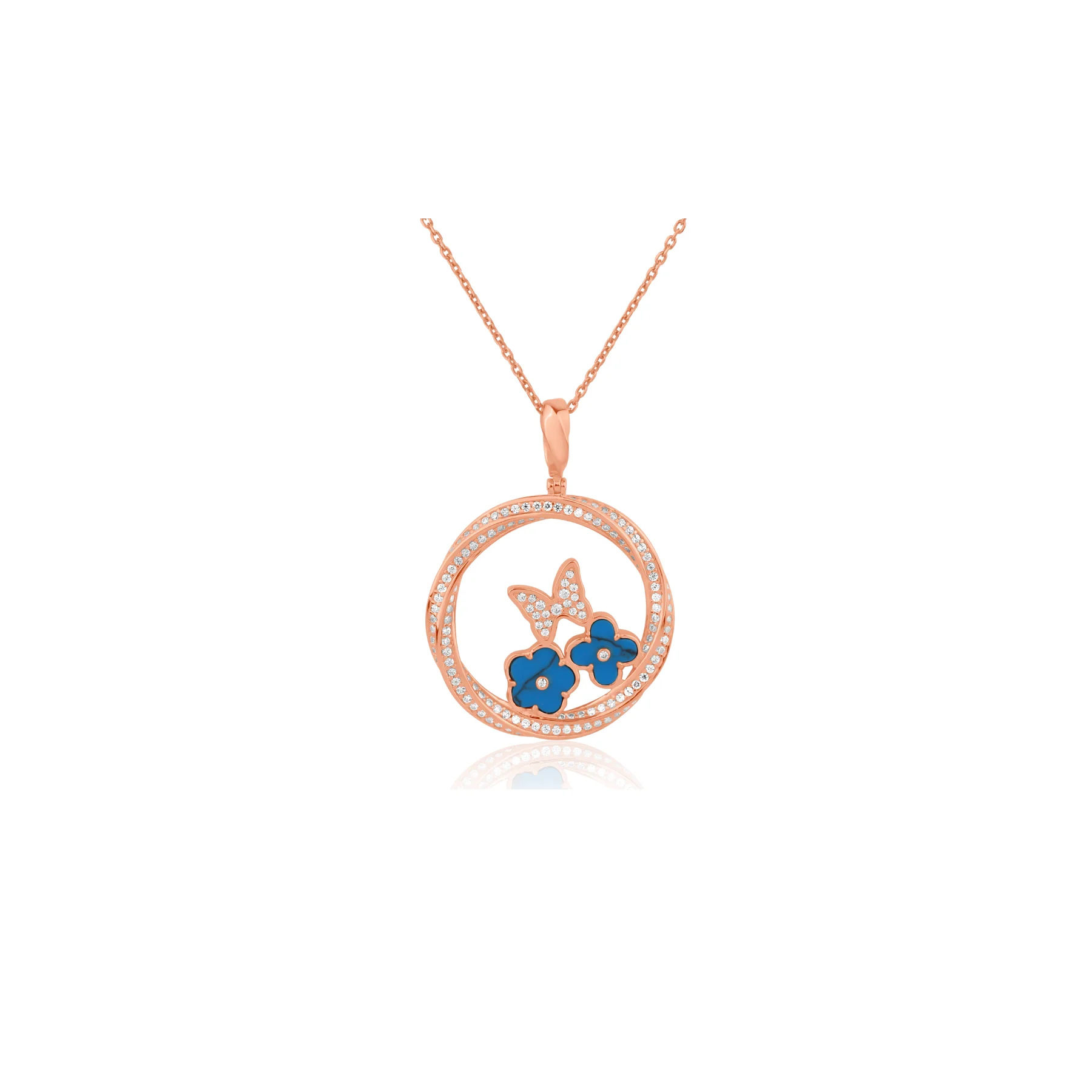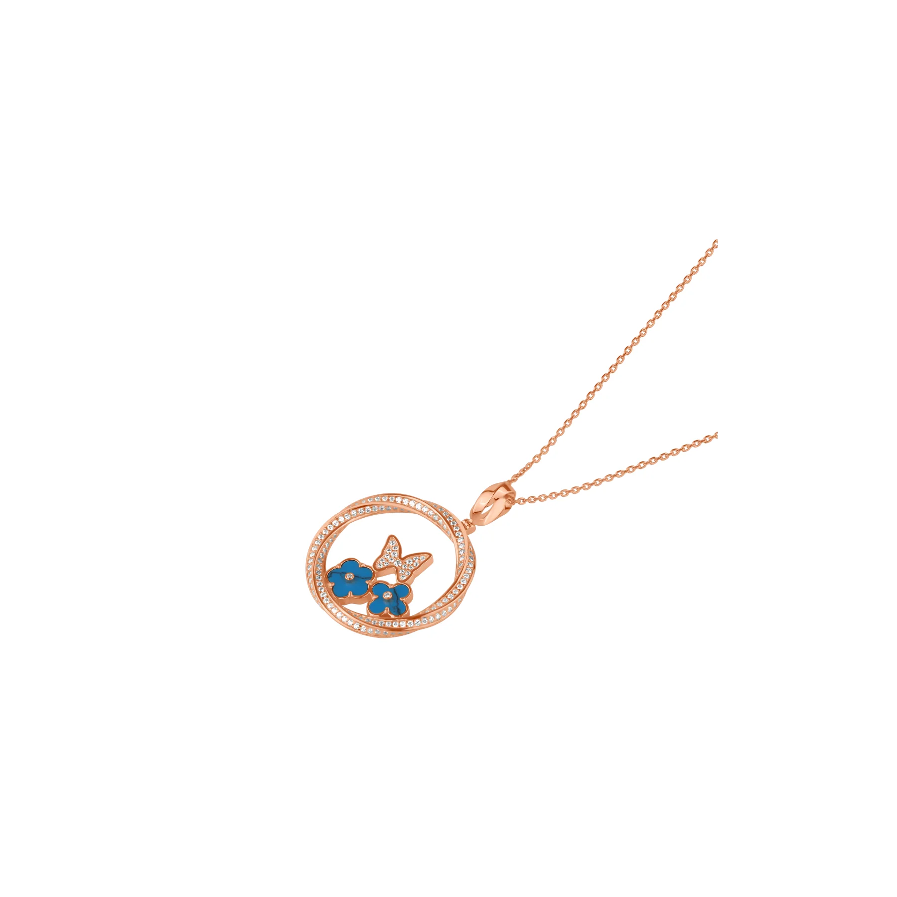 Pendentif circulaire torsadé en Argent 925 rose gold, orné de 3 motifs, papillon serti de zirconiums, fleur 5 petales et trèfle sertis de turquoise. Diamètre 28 mm.