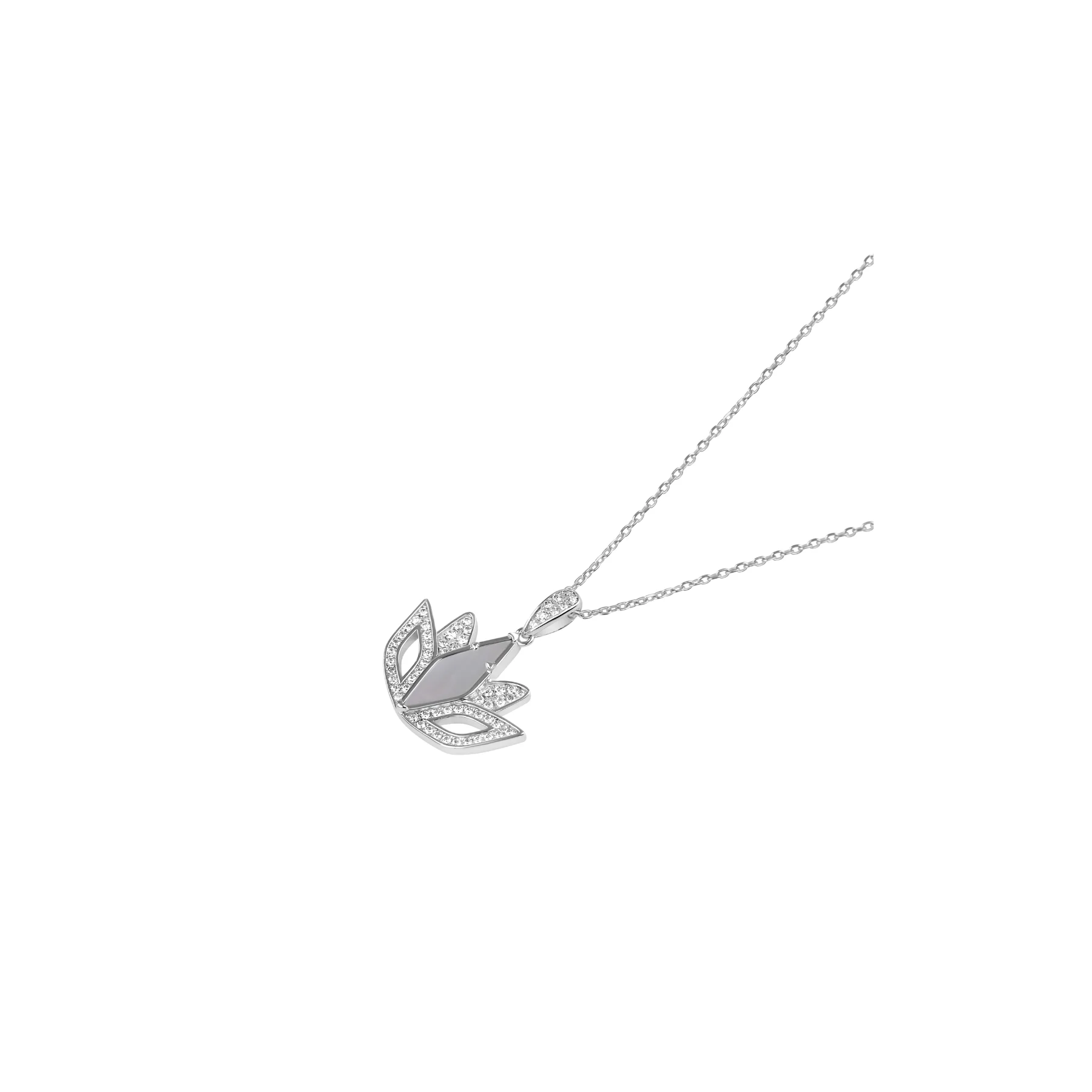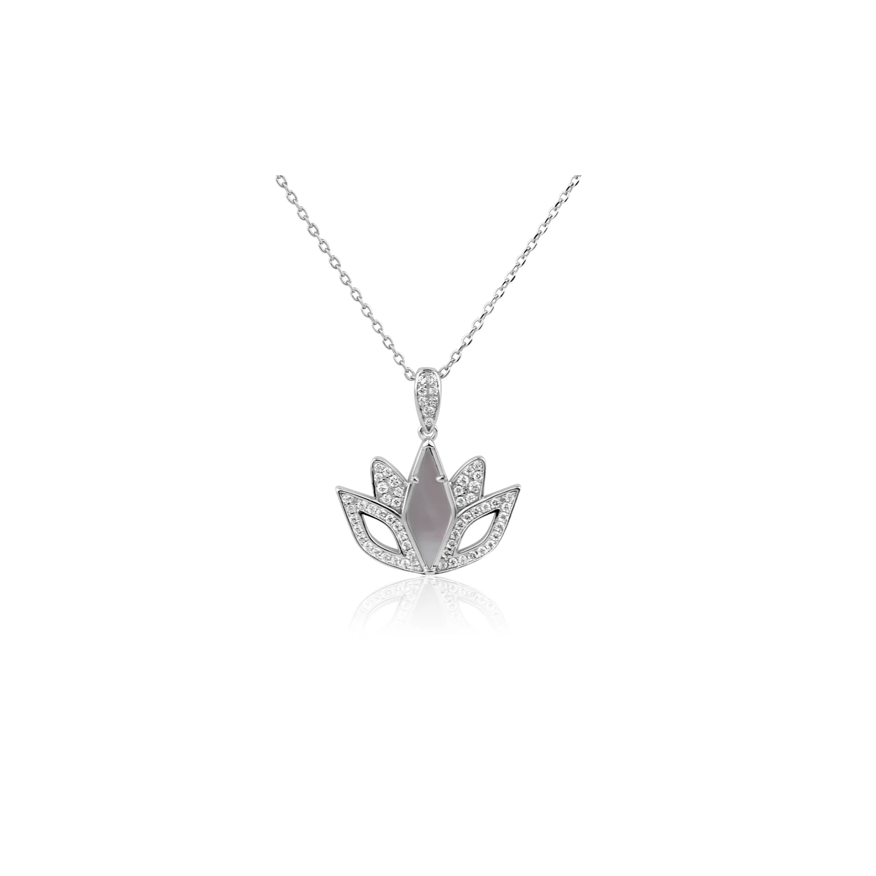 Pendentif tulipe en Argent 925 rhodié, orné de nacre, serti de zirconiums. Dimensions du motif 22 x 24 mm.