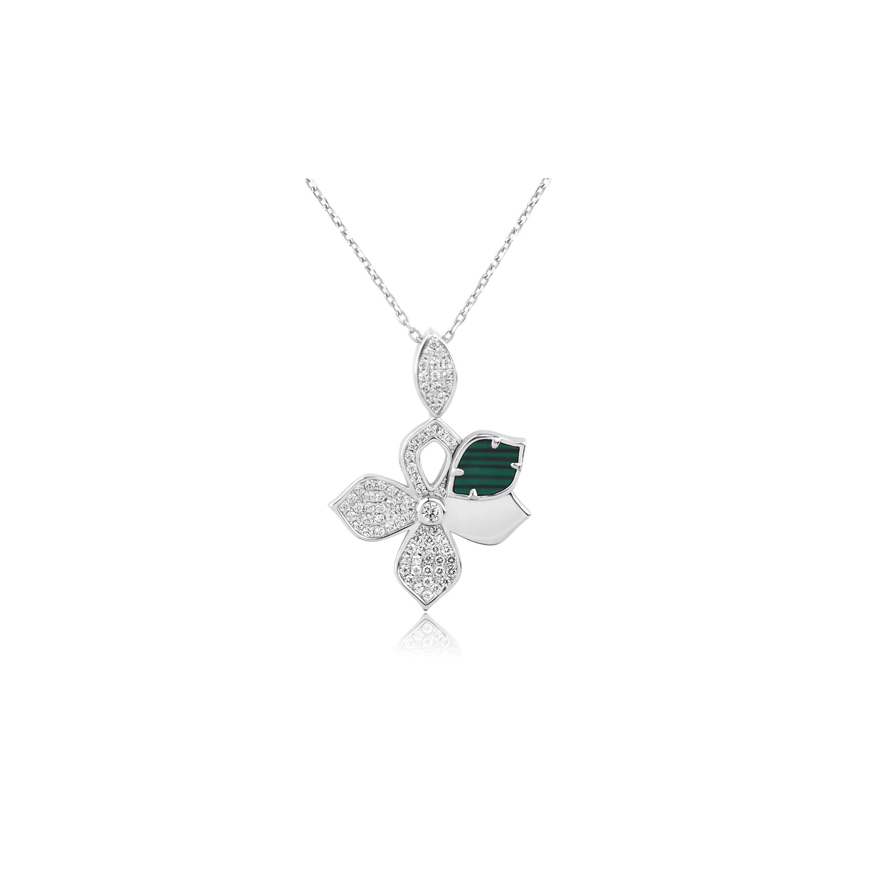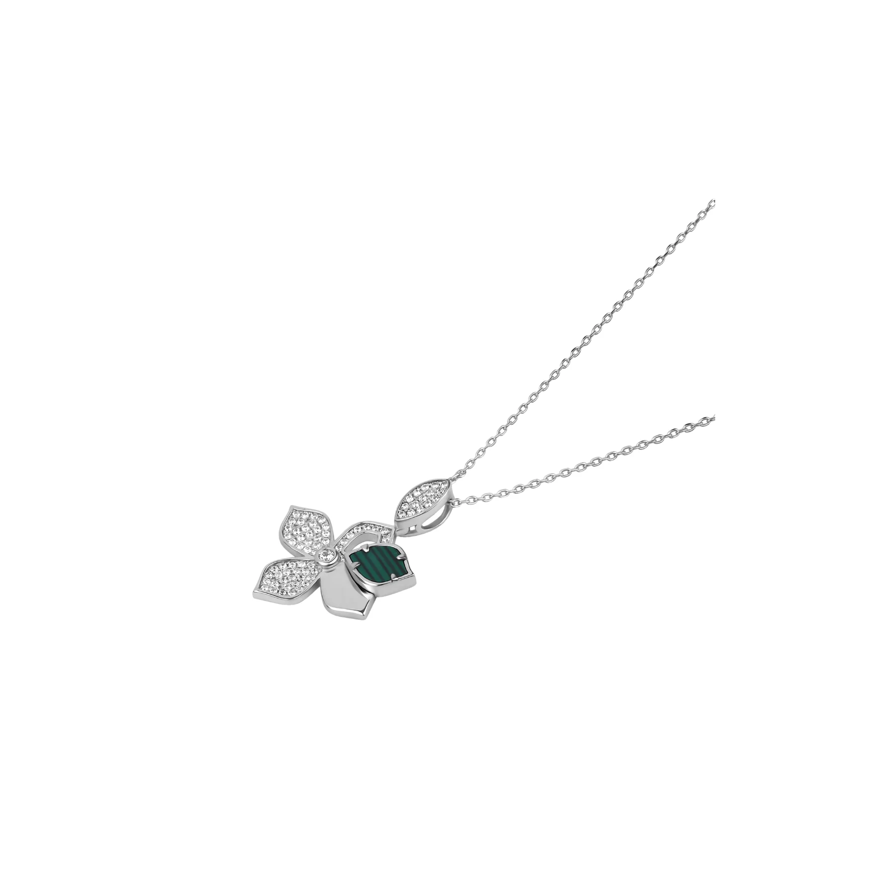 Pendentif trèfle en Argent 925 rhodié, orné de malachite, serti de zirconiums. Dimensions du motif 22 x 24 mm.