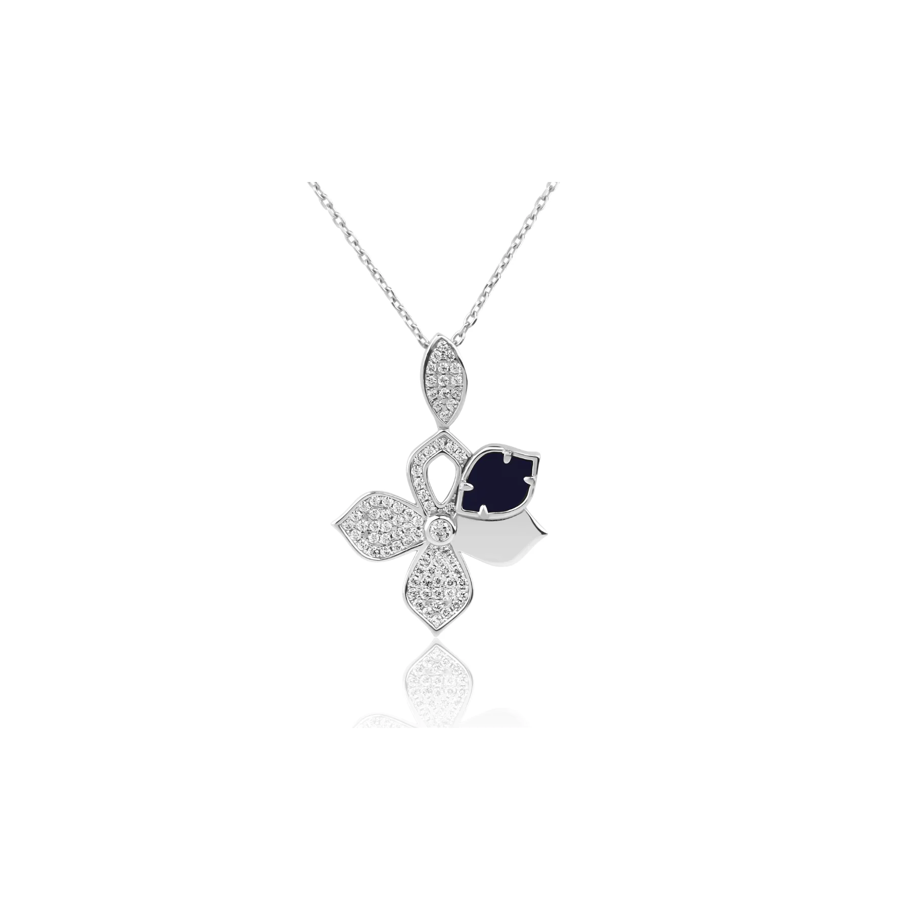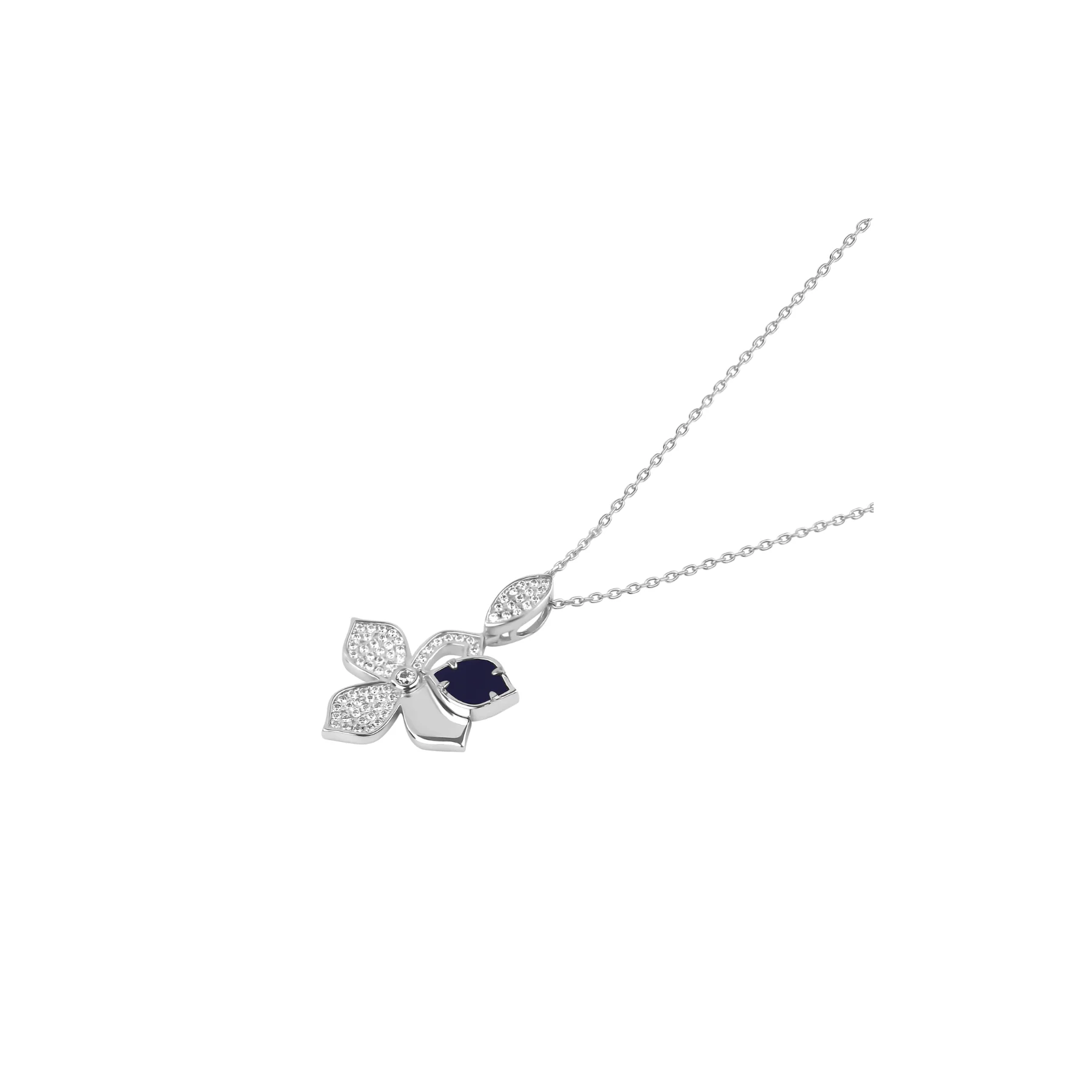 Pendentif trèfle en Argent 925 rhodié, orné de lapis lazuli, serti de zirconiums. Dimensions du motif 22 x 24 mm.