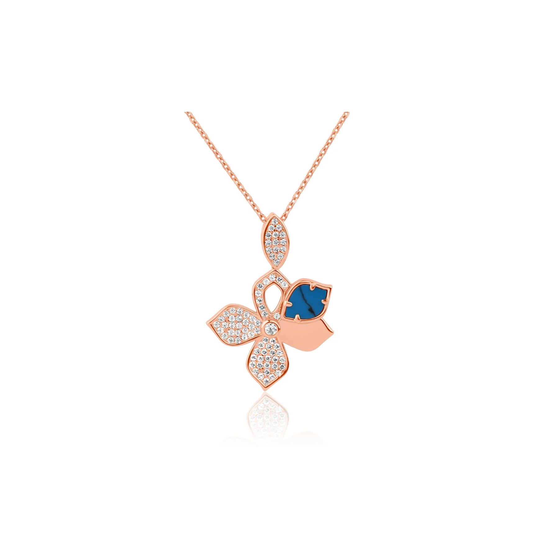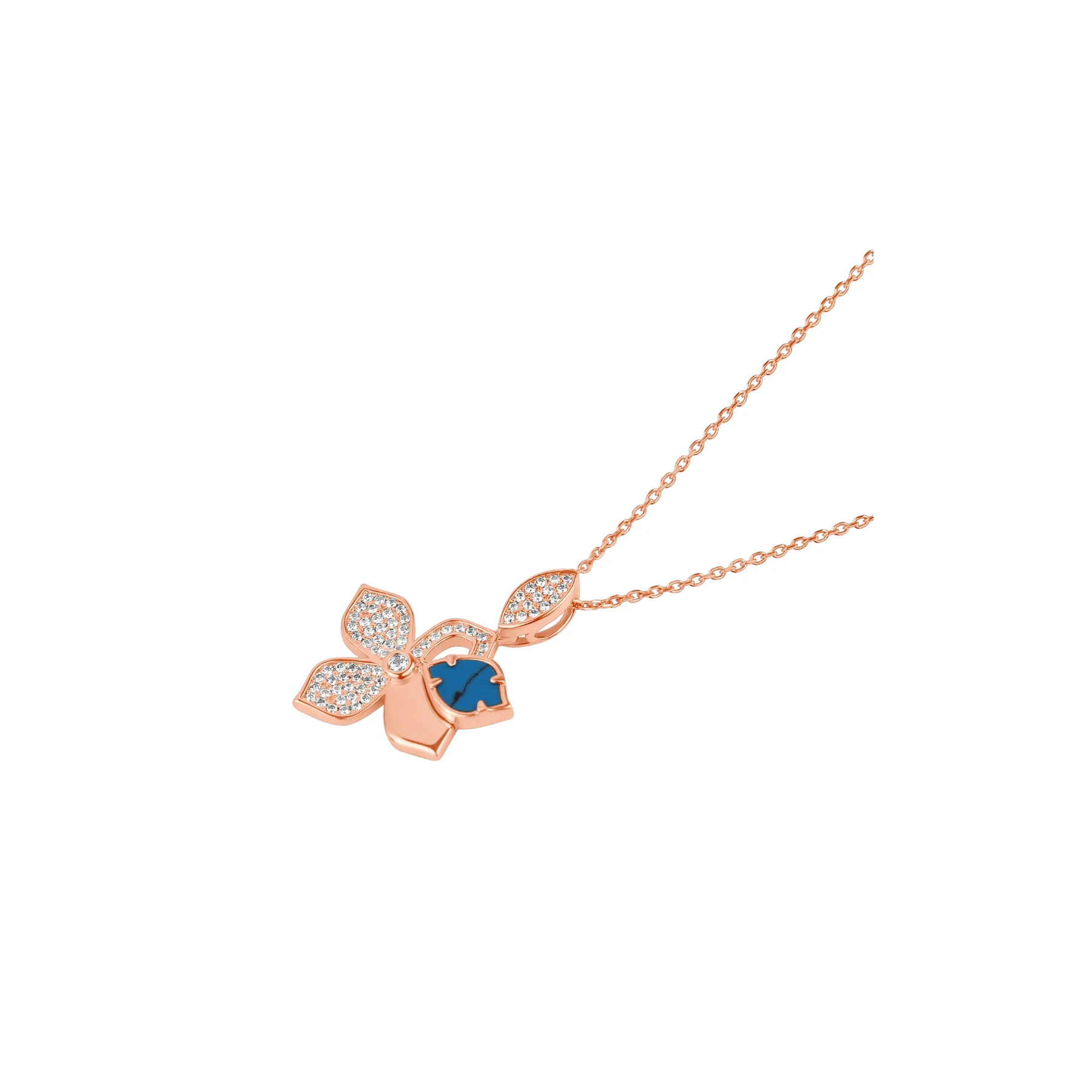 Pendentif trèfle en Argent 925 rose gold, orné de turquoise, serti de zirconiums. Dimensions du motif 22 x 24 mm.