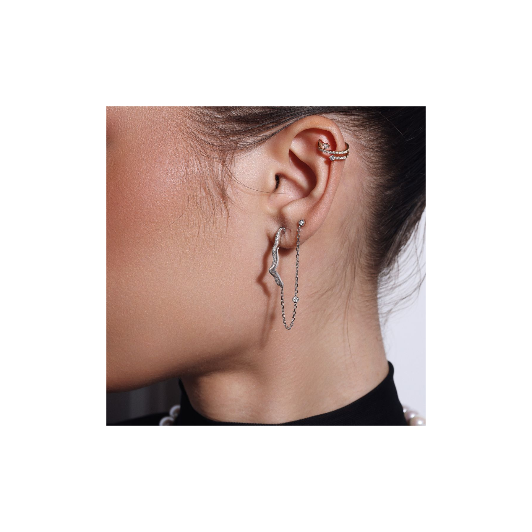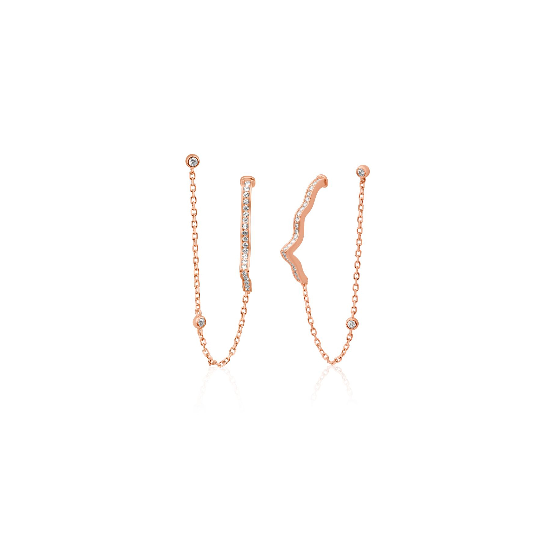 FEMMEBoucles d'oreilles forme semi khmissa en Argent 925 rose gold, serties de zirconiums, avec chaînette a accrocher sur l'hélix. Hauteur de la boucle 25 mm. Longueur de la chaîne 60 mm.