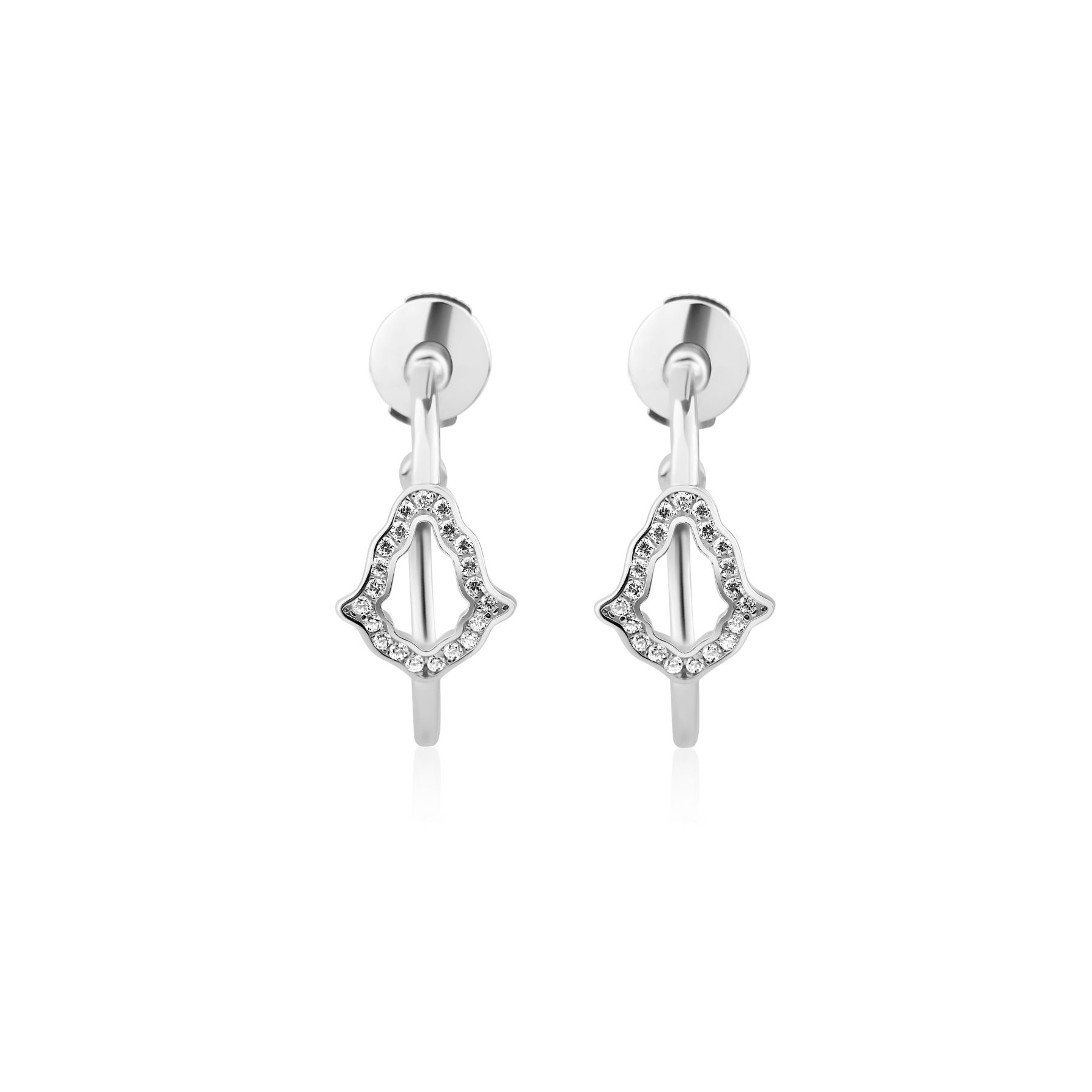Créoles Khmissa Excellence en Argent 925 rhodié, avec Khmissa sertie de zirconiums. Diamètre de la boucle 25 mm. Dimensions du motif 10 x 13 mm.