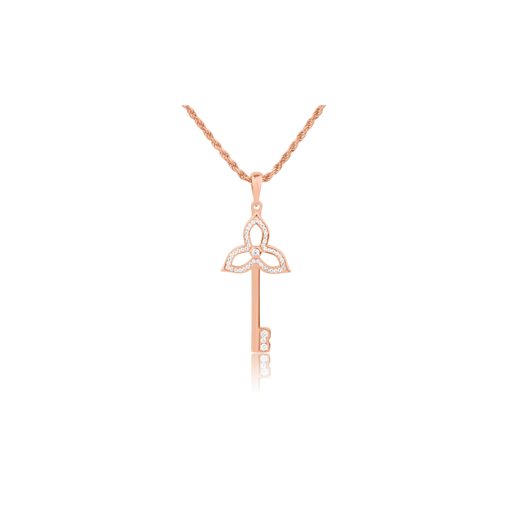 Pendentif clé en argent 925 rose gold, avec motif fleur 3 pétales, serti de zirconiums. Hauteur du pendentif 45 mm.