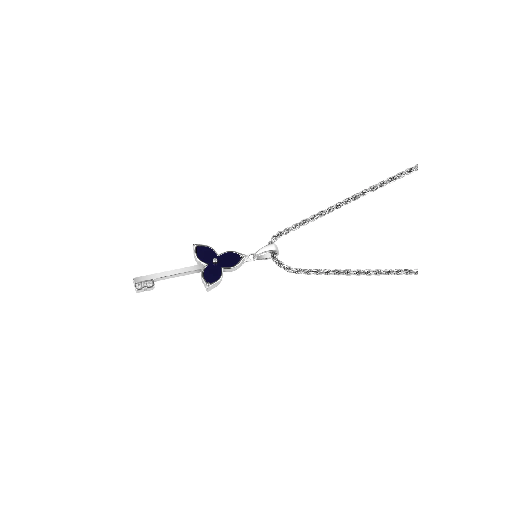 Pendentif clé en argent 925 rhodié, avec motif fleur 3 pétales, serti de lapis lazuli, zirconiums. Hauteur du pendentif 45 mm.