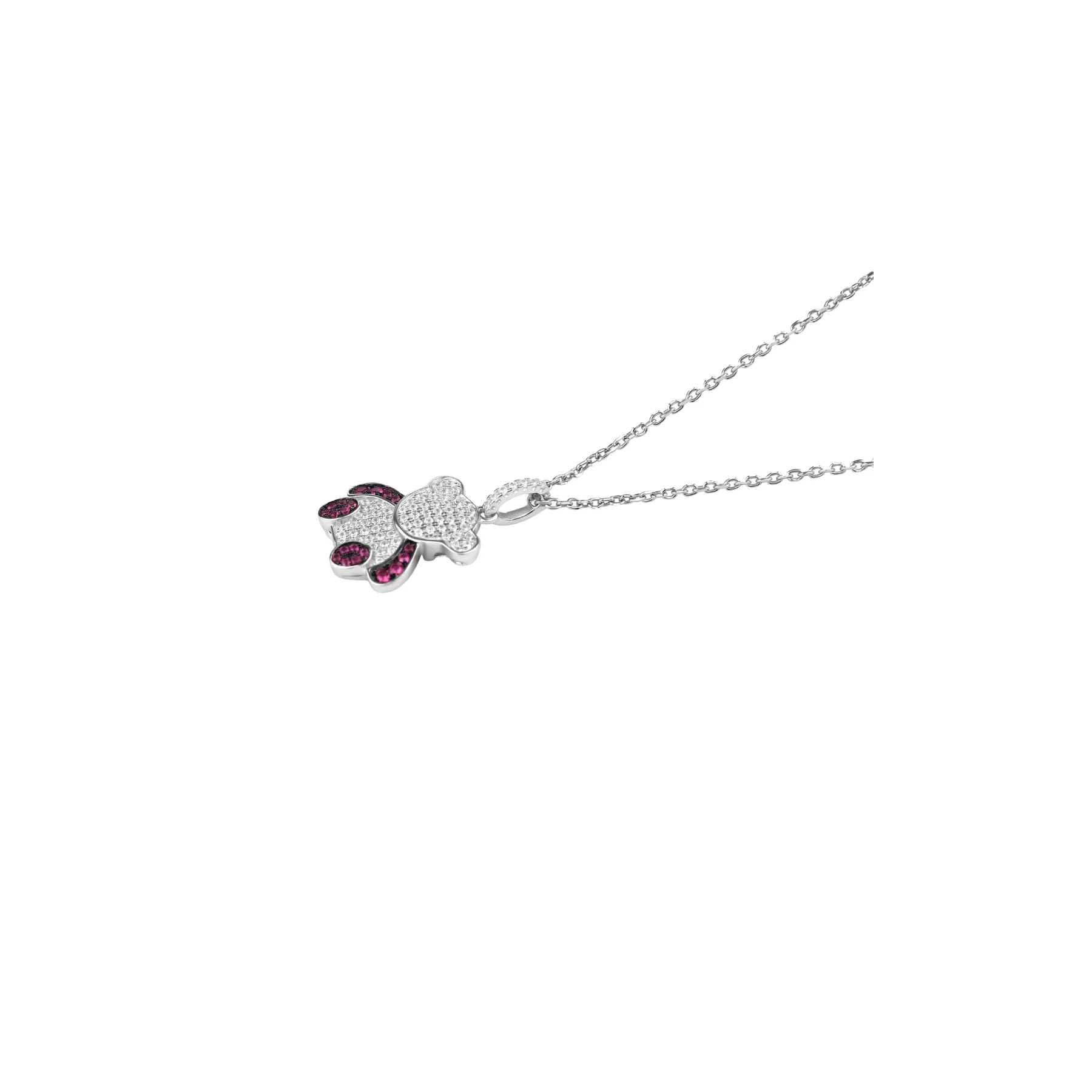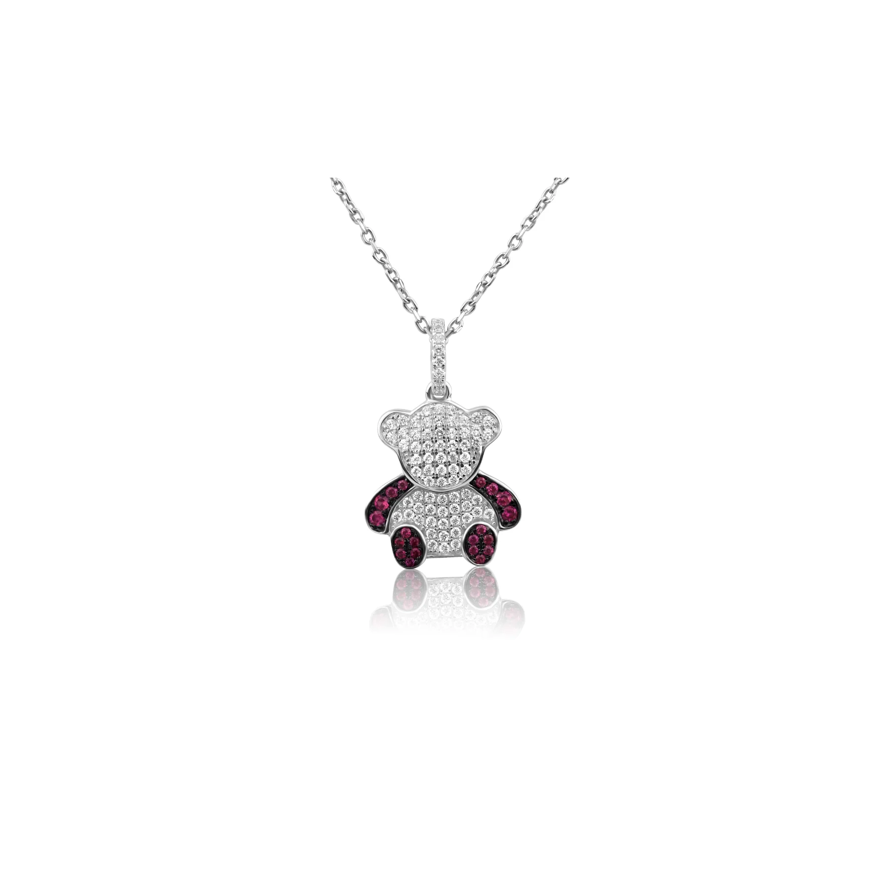 Pendentif nounours en argent 925 rhodié, serti de zirconiums , Ruby synthétique. Hauteur du pendentif 25 mm.