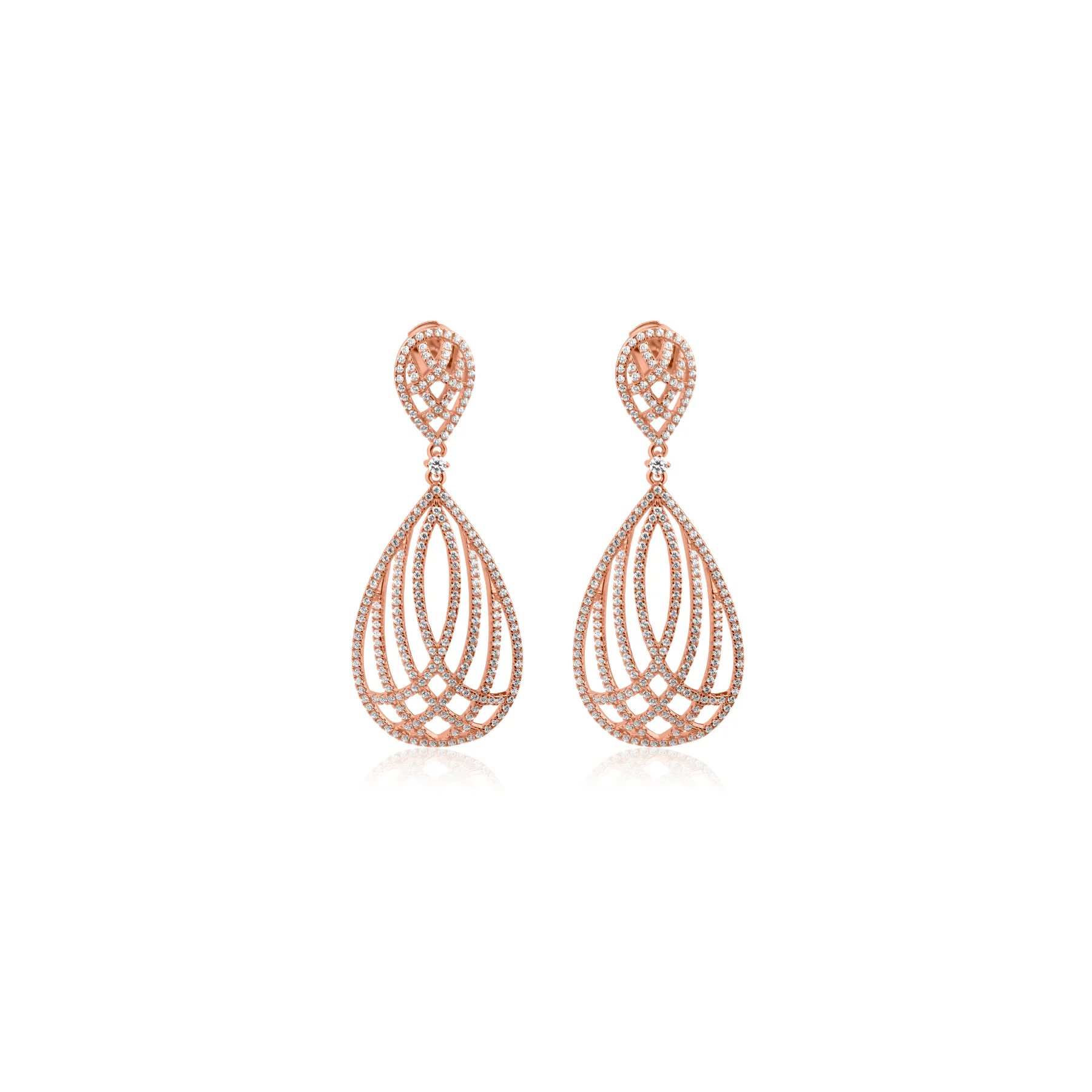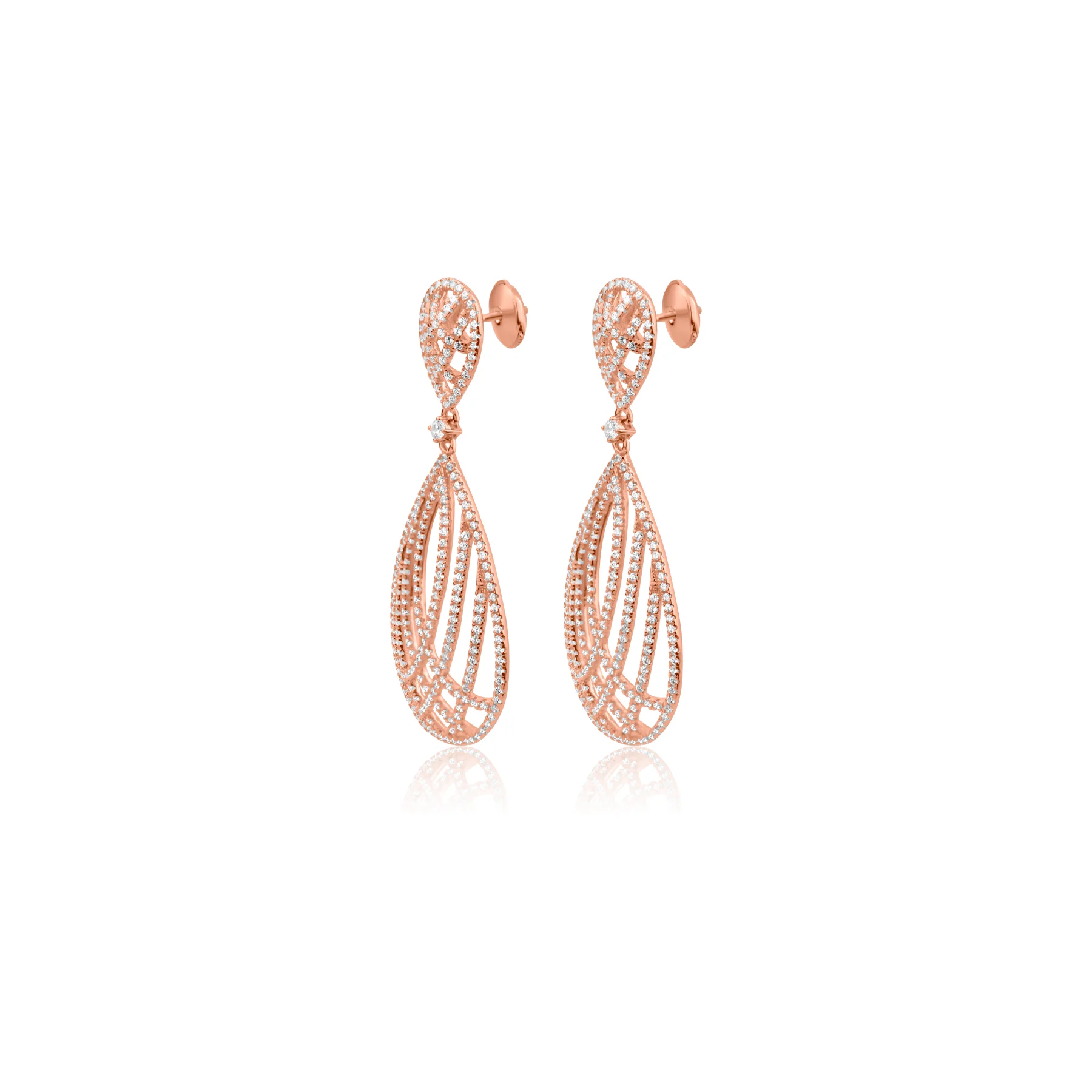 Boucles d'oreilles de forme ovale pendantes en Argent 925 rose gold, serties de zirconiums. Hauteur de la boucle 52 mm, Largeur 22 mm.