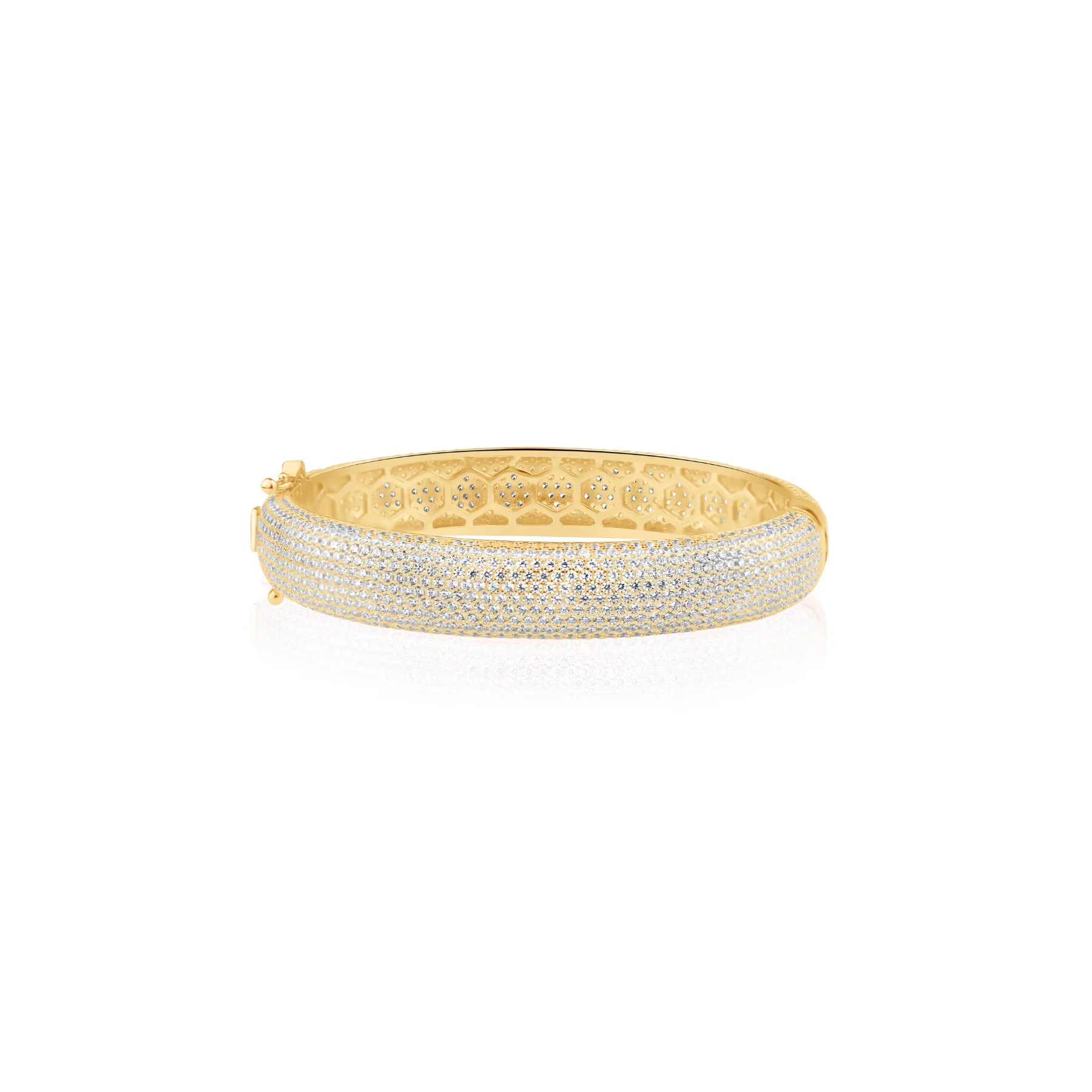 Avec ses dimensions idéales (58 mm de diamètre, 52 mm de hauteur et 11 mm de largeur), ce bracelet s'adapte parfaitement à toutes les morphologies. Le plaqué or 18K , appliqué avec une épaisseur généreuse de 3 microns, garantit une résistance exceptionnelle au ternissement. Les zirconiums blancs , méticuleusement sertis en technique pavé, captent la lumière avec une intensité remarquable.
