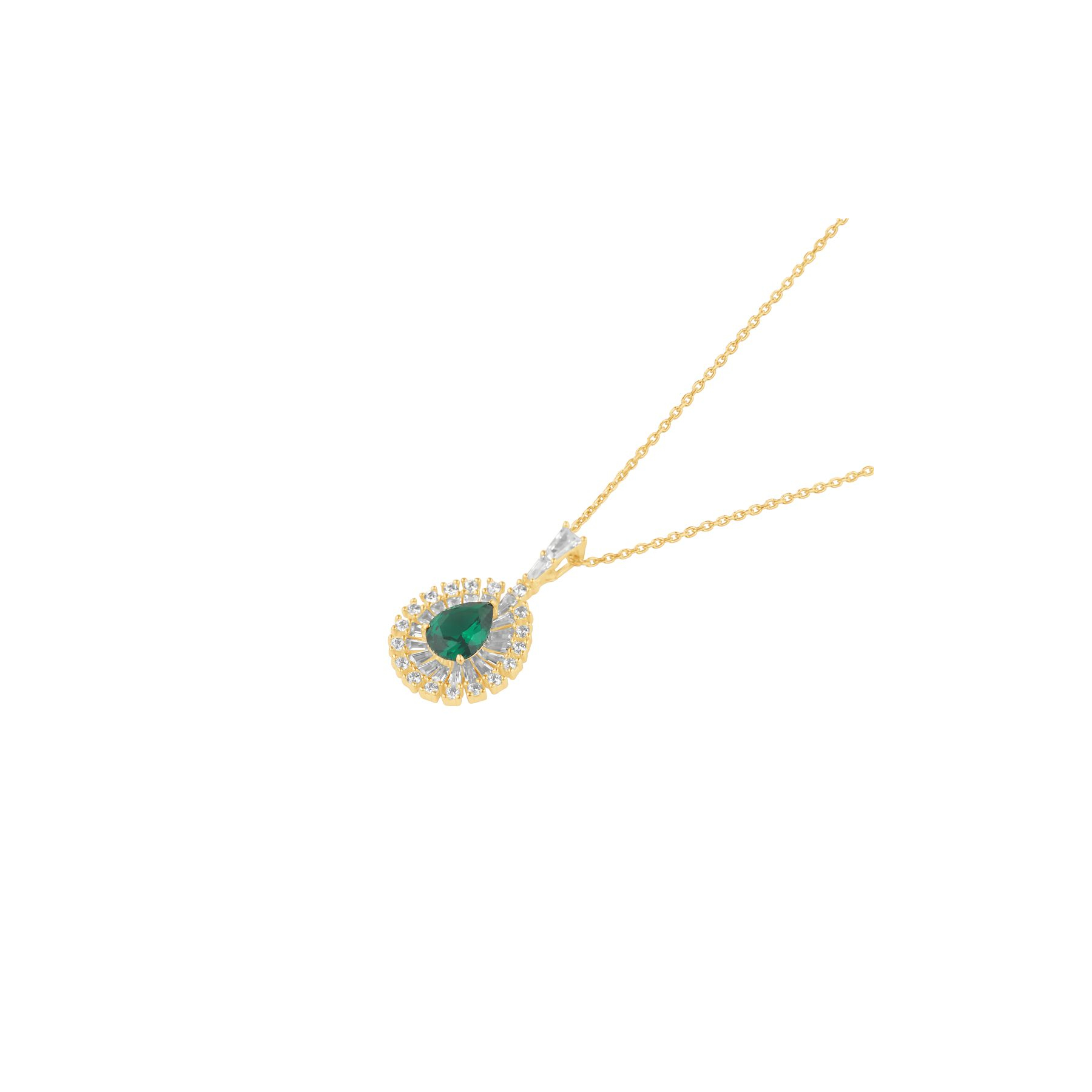 Pendentif poire Excellence Plaqué Or 18K 3Mic, serti d'une émeraude synthetique taille poire, de zirconiums taille brillant, et baguette. Hauteur du pendentif 25 mm.