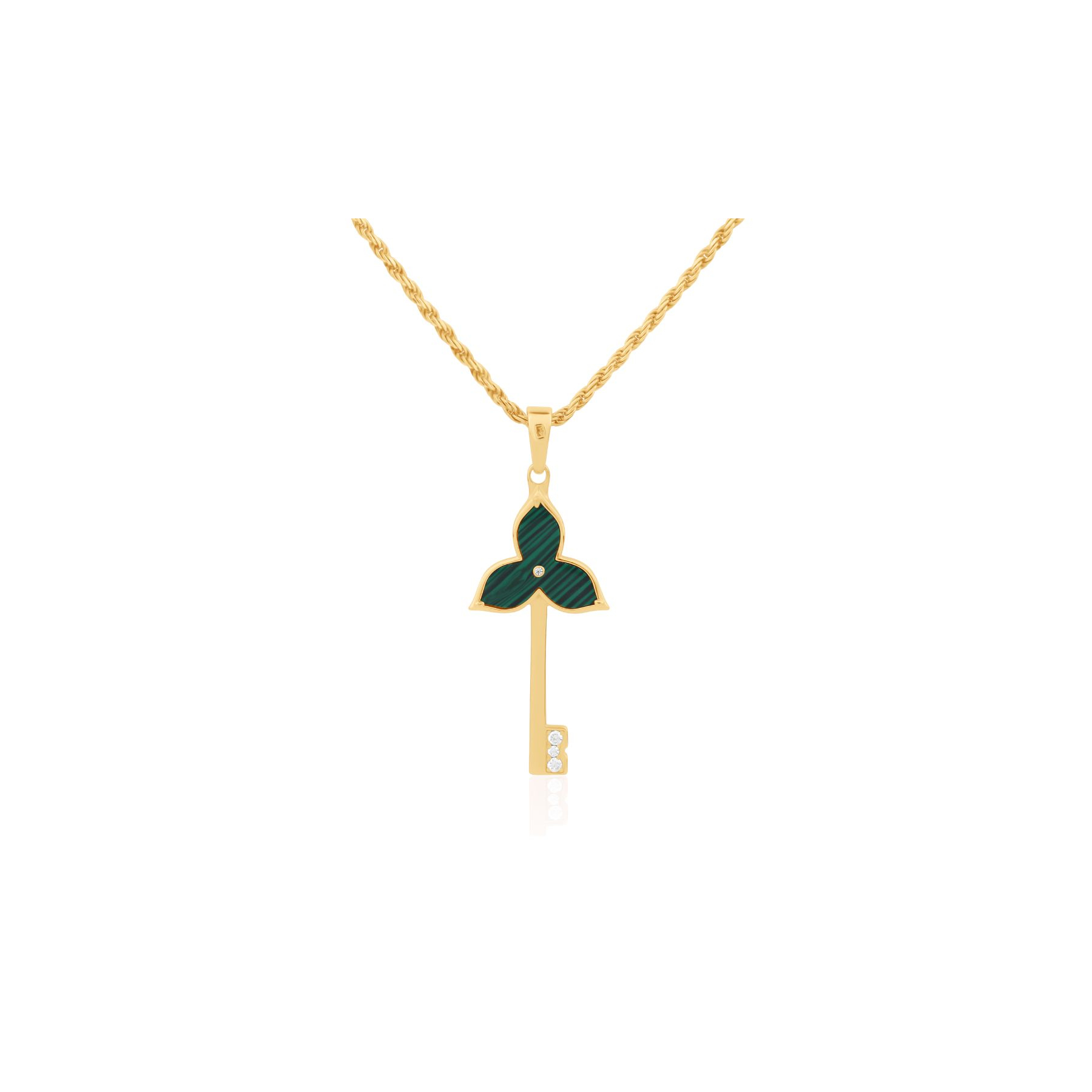 Le Pendentif Key Flower Excellence plaqué or 18K 3Mic est une création élégante et raffinée, pensée pour celles qui recherchent un bijou symbolique au style affirmé. Ce pendentif se distingue par son design original en forme de clé, orné d’un motif fleur à trois pétales, délicatement serti de malachite et de zirconiums.