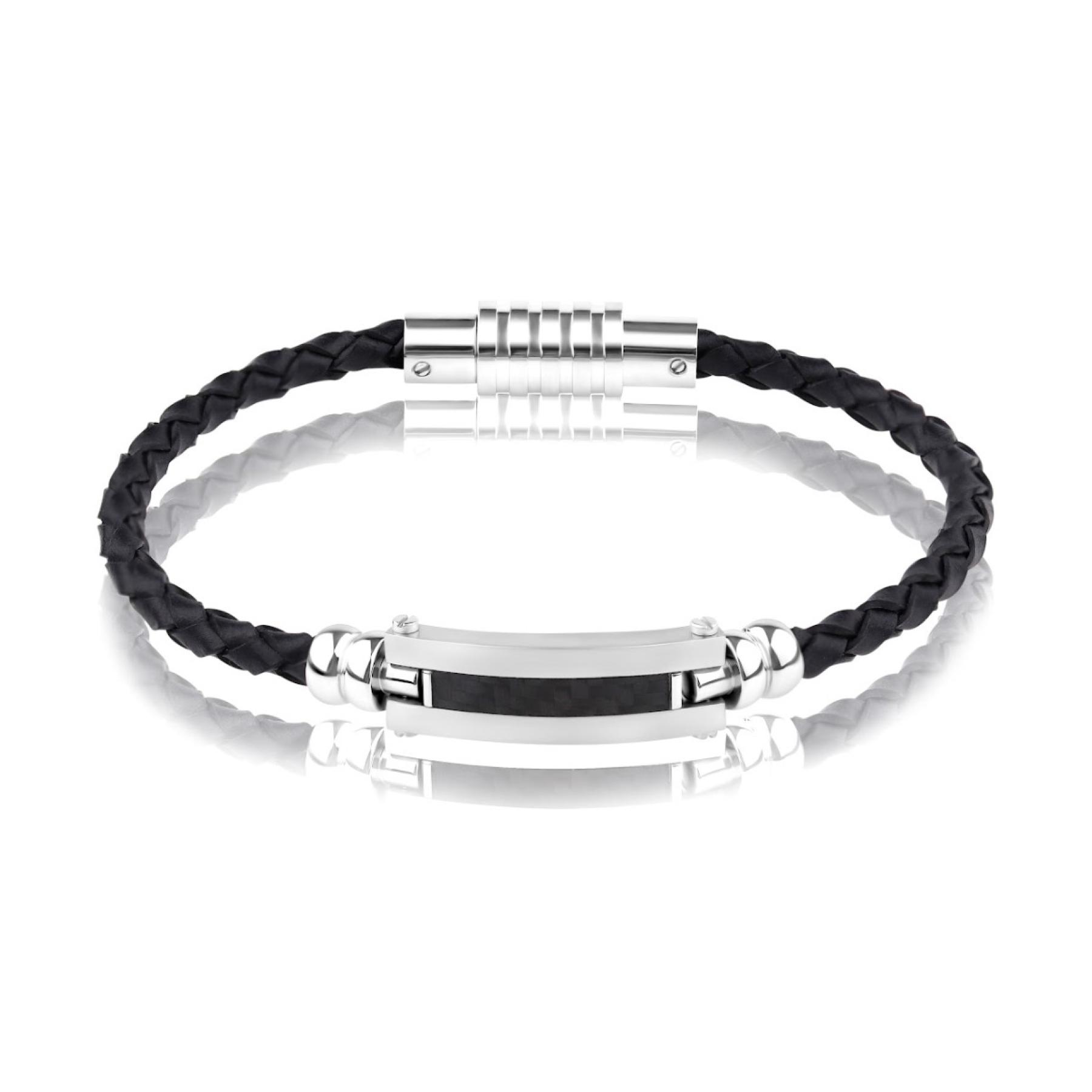Bracelet en cuir tressé, avec pièce centrale en acier 316L ornée de carbone, fermoir en acier 316L.