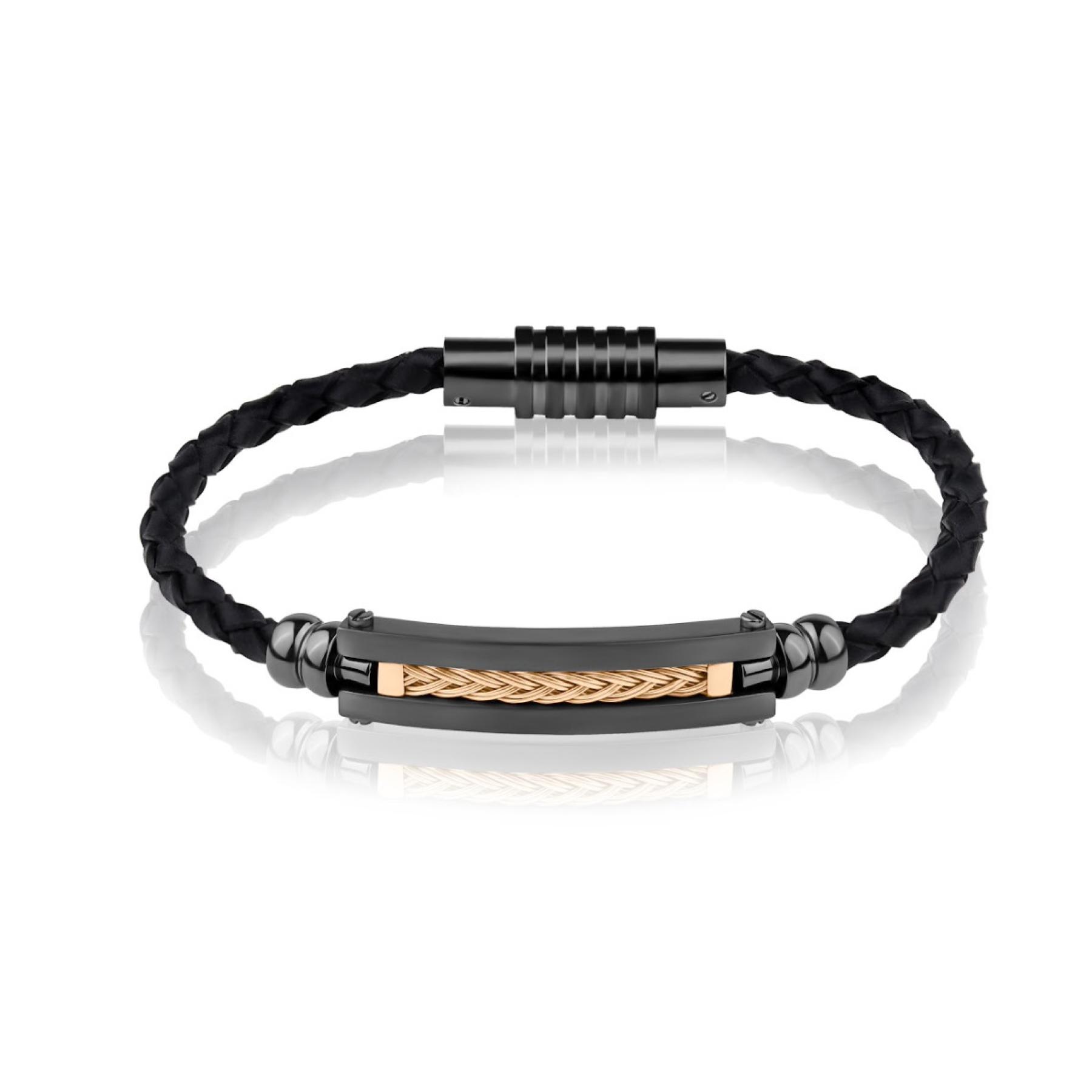 Bracelet en cuir tressé, avec pièce centrale en acier 316L PVD noir, ornée d'une tresse en acier PVD rose, fermoir en acier 316L.