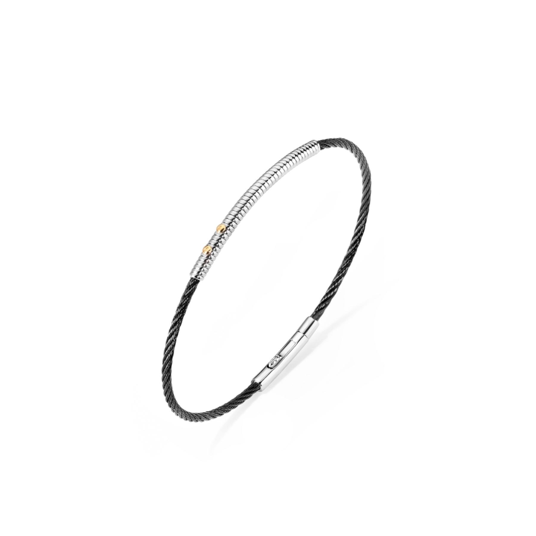 Le motif central mesure 45 mm de longueur et s’inscrit parfaitement dans un design contemporain et masculin. Son câble de 2 mm d’épaisseur assure un équilibre idéal entre robustesse et confort, tandis que le diamètre de 53 x 63 mm correspond à une taille Medium adaptée à la majorité des poignets. Ce bracelet medium est facile à porter au quotidien et s’harmonise avec toutes vos tenues, du casual chic au look plus formel.