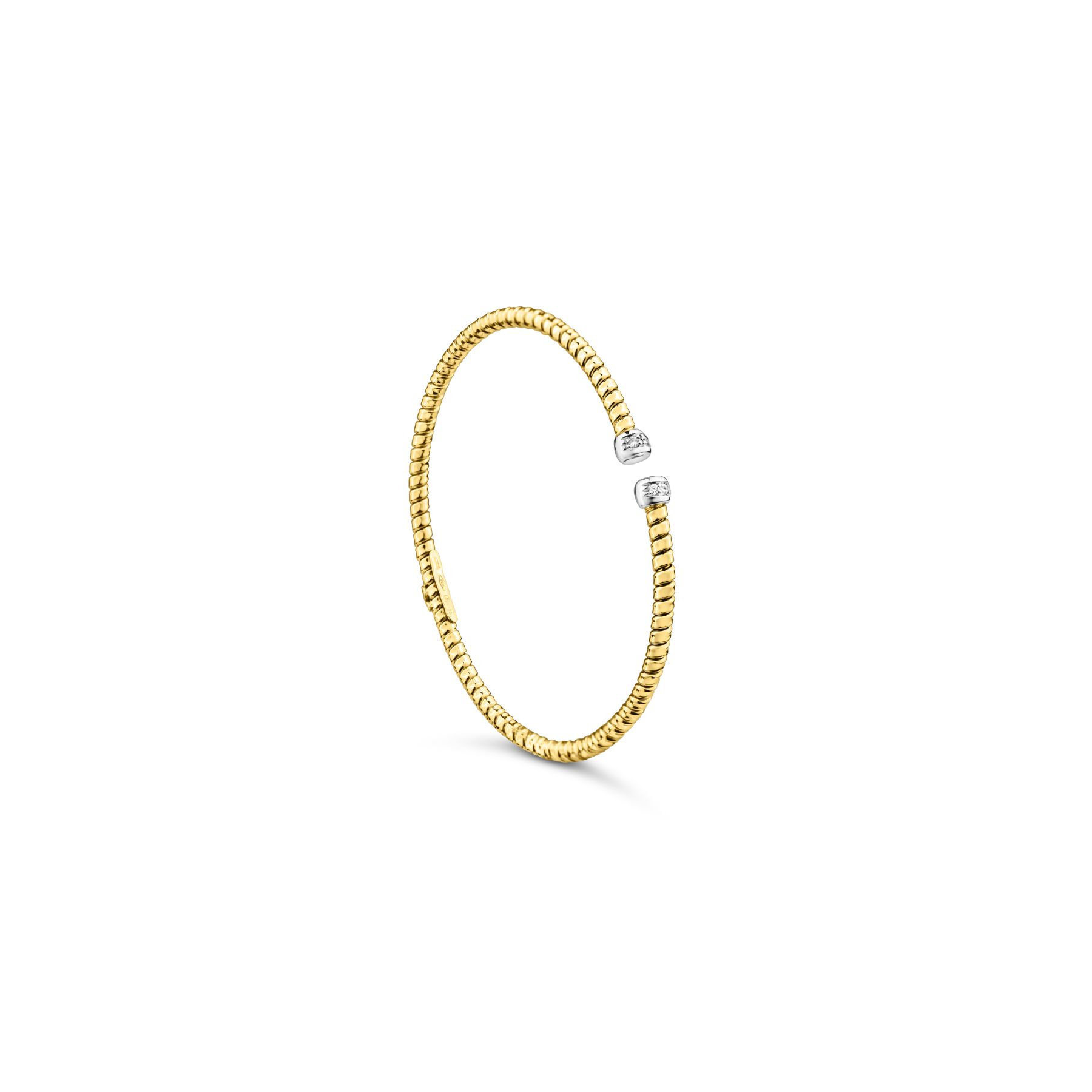 Avec ses dimensions de 55 x 45 mm, ce bracelet en or est idéal pour sublimer votre poignet tout en apportant une touche de sophistication. Les diamants, sertis avec soin aux extrémités du bracelet, ajoutent une brillance discrète mais spectaculaire, offrant ainsi un éclat précieux qui ne manquera pas de captiver l'attention. La forme spirale du bracelet permet une mise en valeur élégante, tout en assurant un confort optimal grâce à son ajustement parfait.
