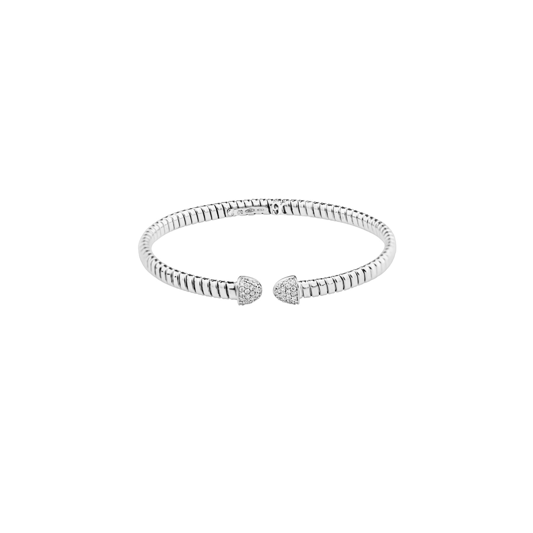Bracelet Excellence Or gris 18k spirale aplati, orné de 2 embouts sertis de diamants pour 0,16 ct. Largeur du bracelet 4,35 mm. diamètre 55 x 45 mm.