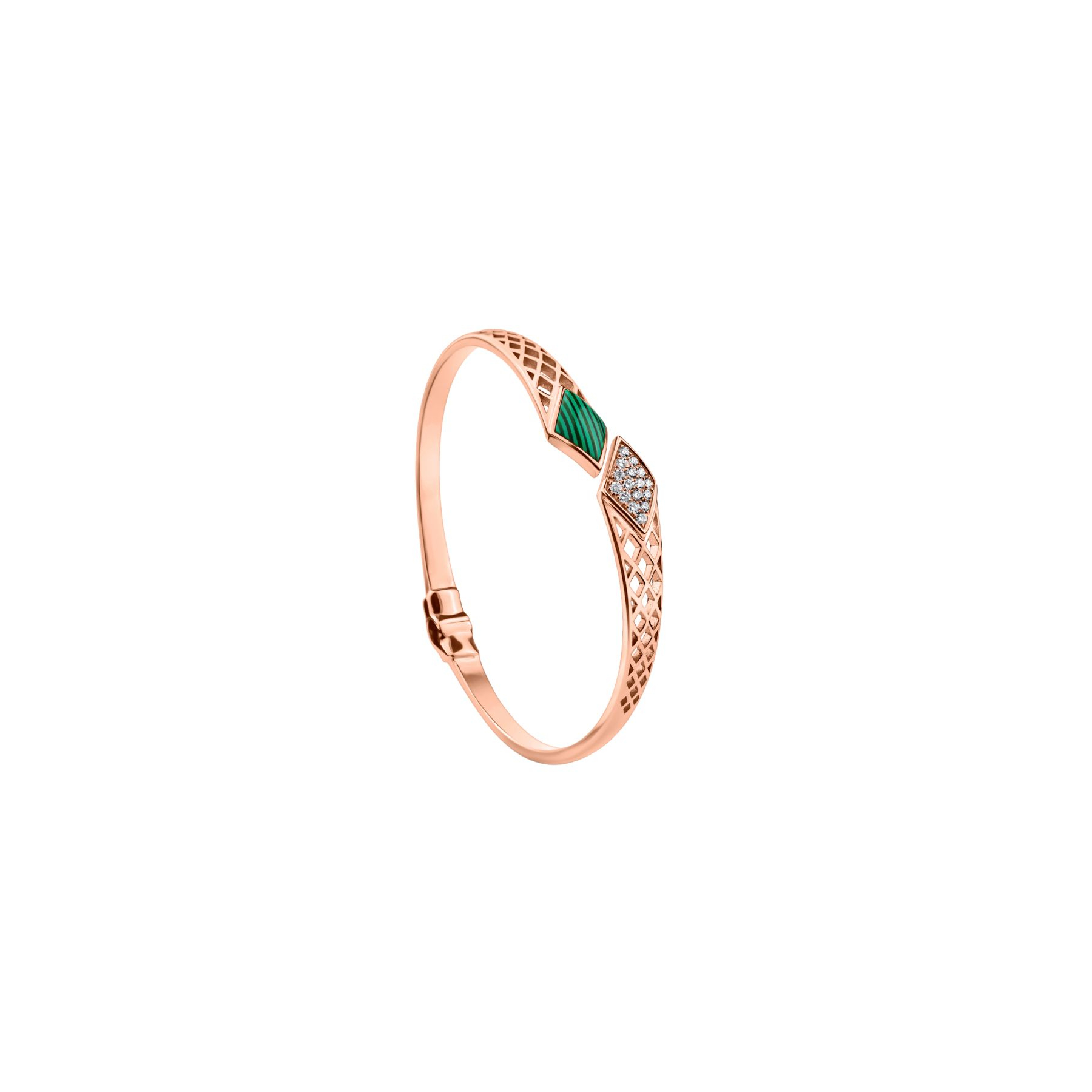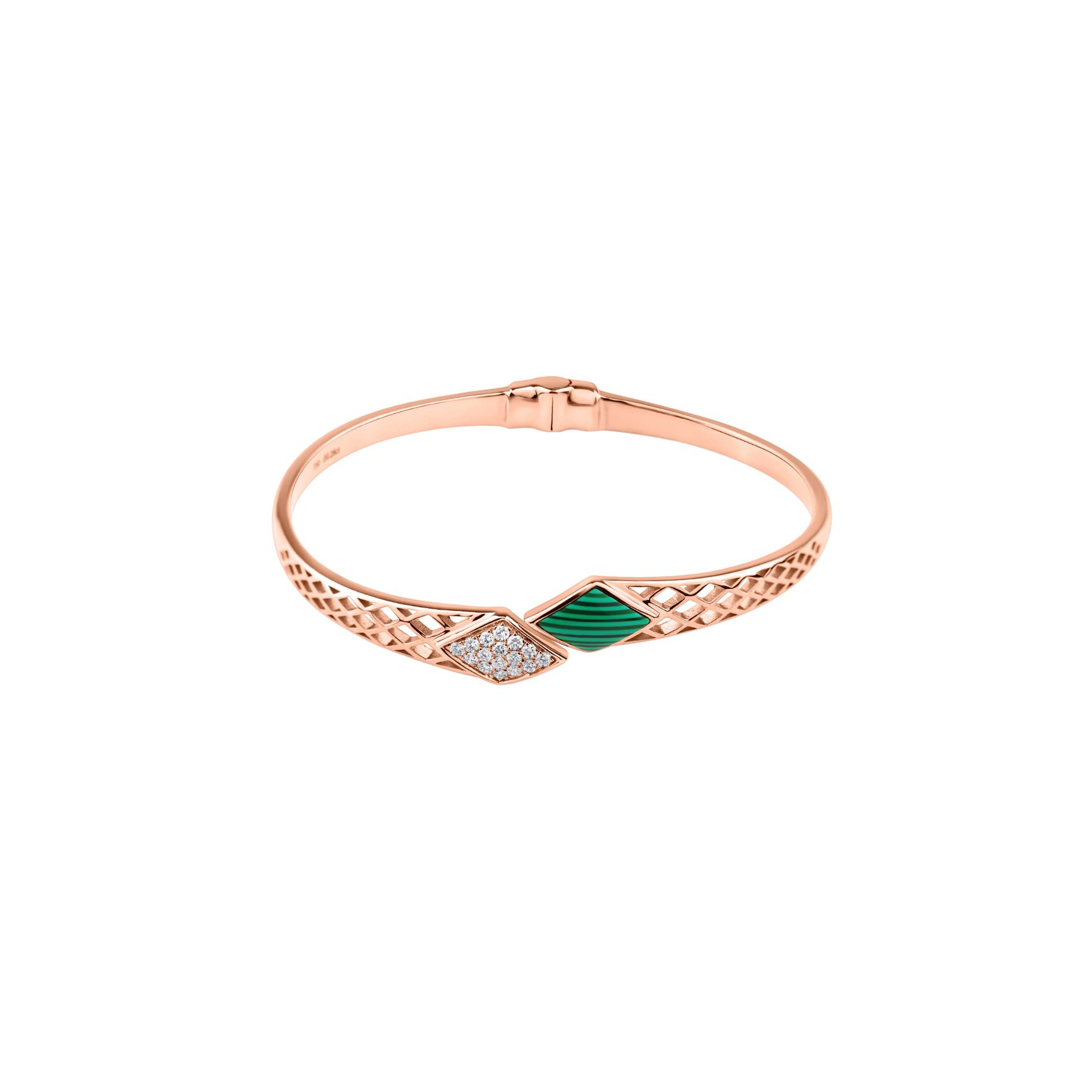 Bracelet Jonc en Or rose 750/1000, serti de diamants pour 0,28 ct, orné d'une Malachite. Dimensions du Jonc 55 x 45 mm.