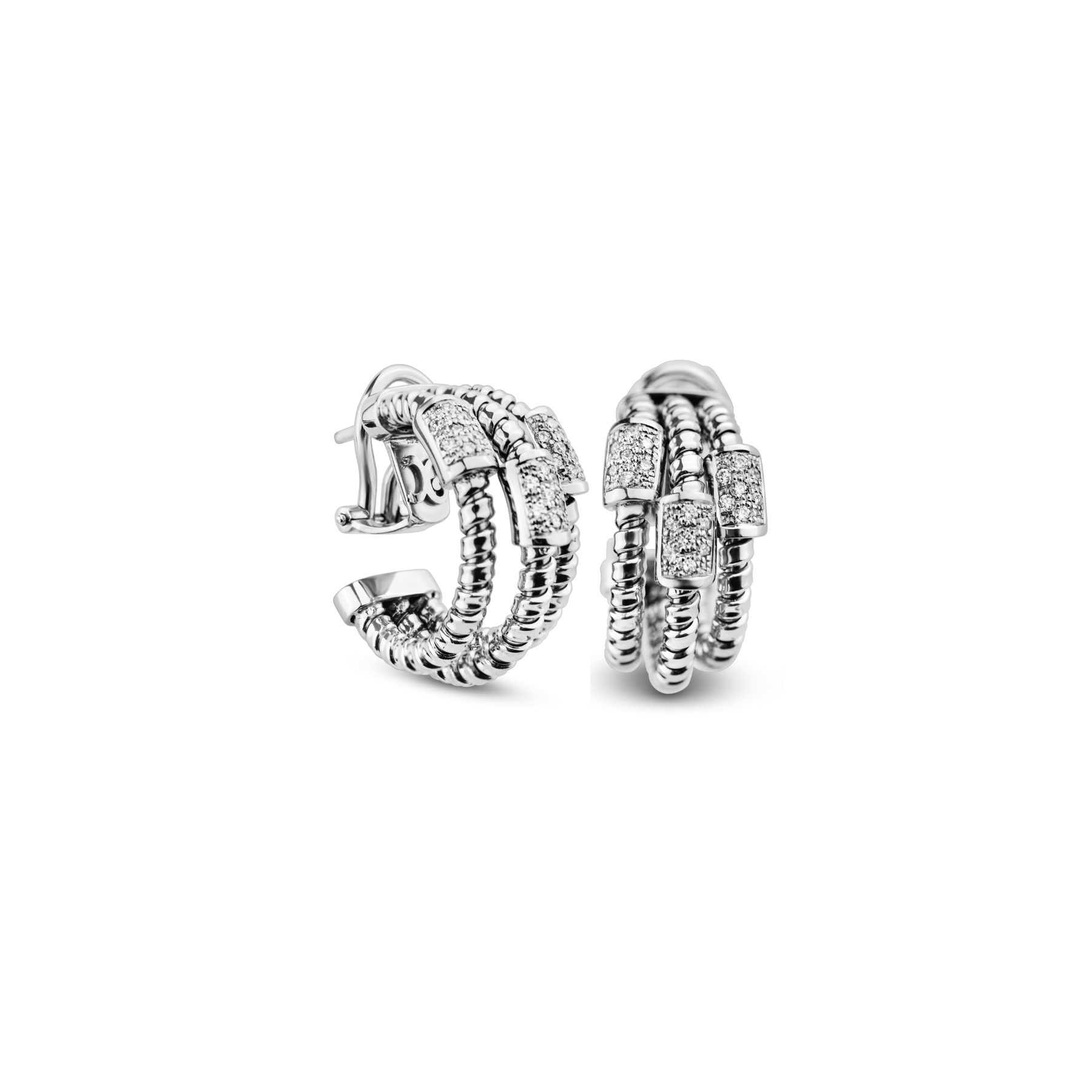 Creoles spirale 3L en Or gris 18k, ornées de 3 motifs, sertis de diamants pour 0,47 ct. Largeur de la boucle 13,3 mm, diamètre 25 mm.