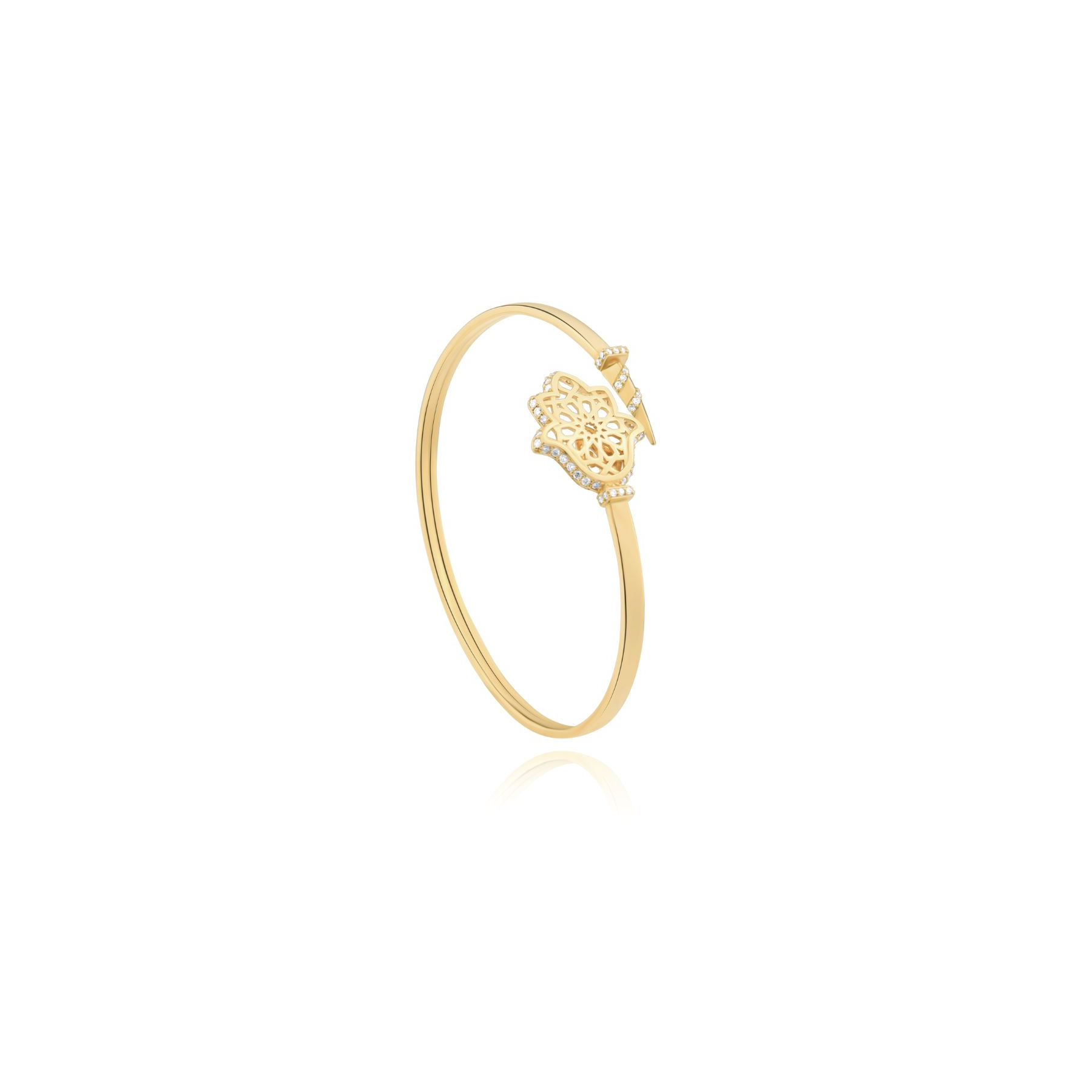 Bracelet jonc khmissa zellige en Or jaune 750/1000, serti de diamants pour 0,50 ct. Diamètre 57 x 47 mm.