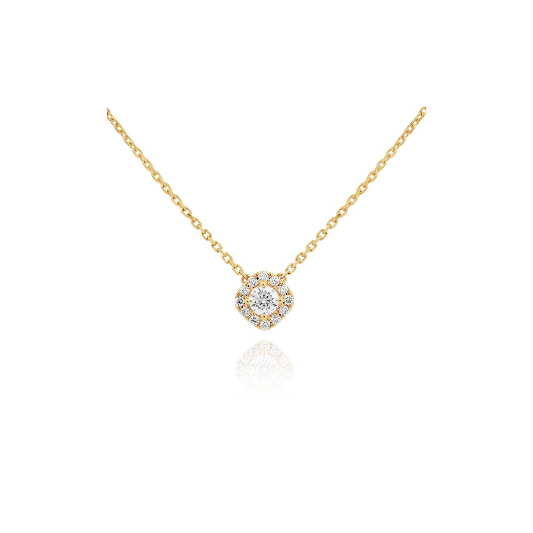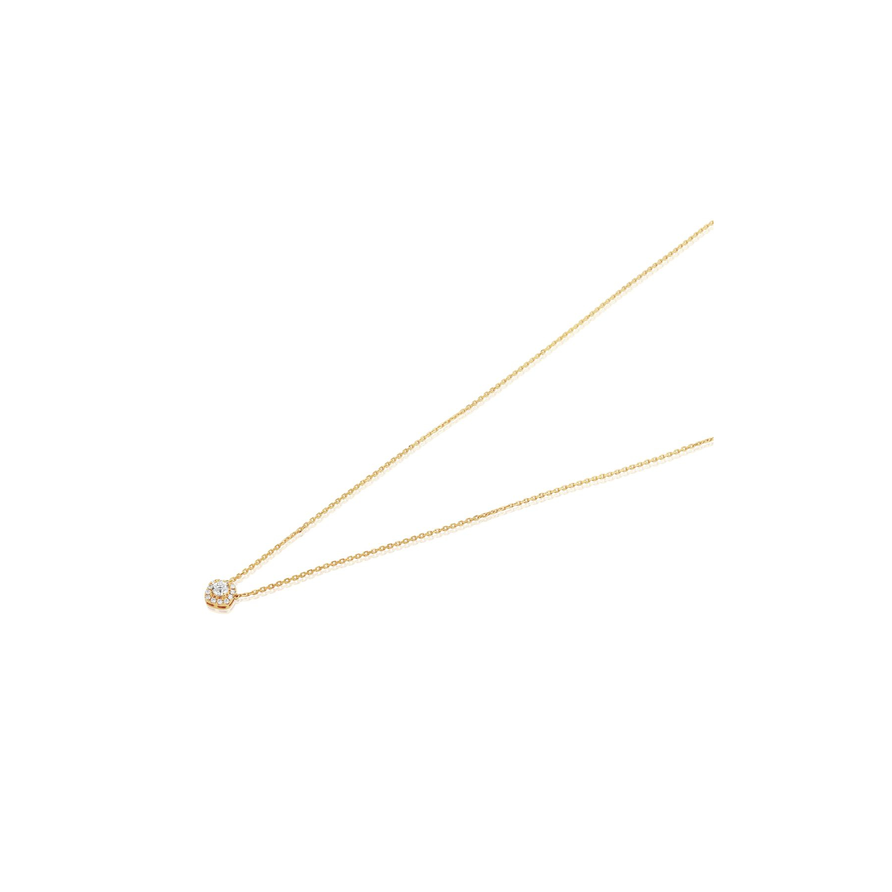 Collier Excellence Or jaune 750/1000, marguerite de forme losange, serti de diamants taille brillant pour 0,35 ct. Taille du motif 8 mm, longueur de la chaine 415 - 440 - 465 mm.