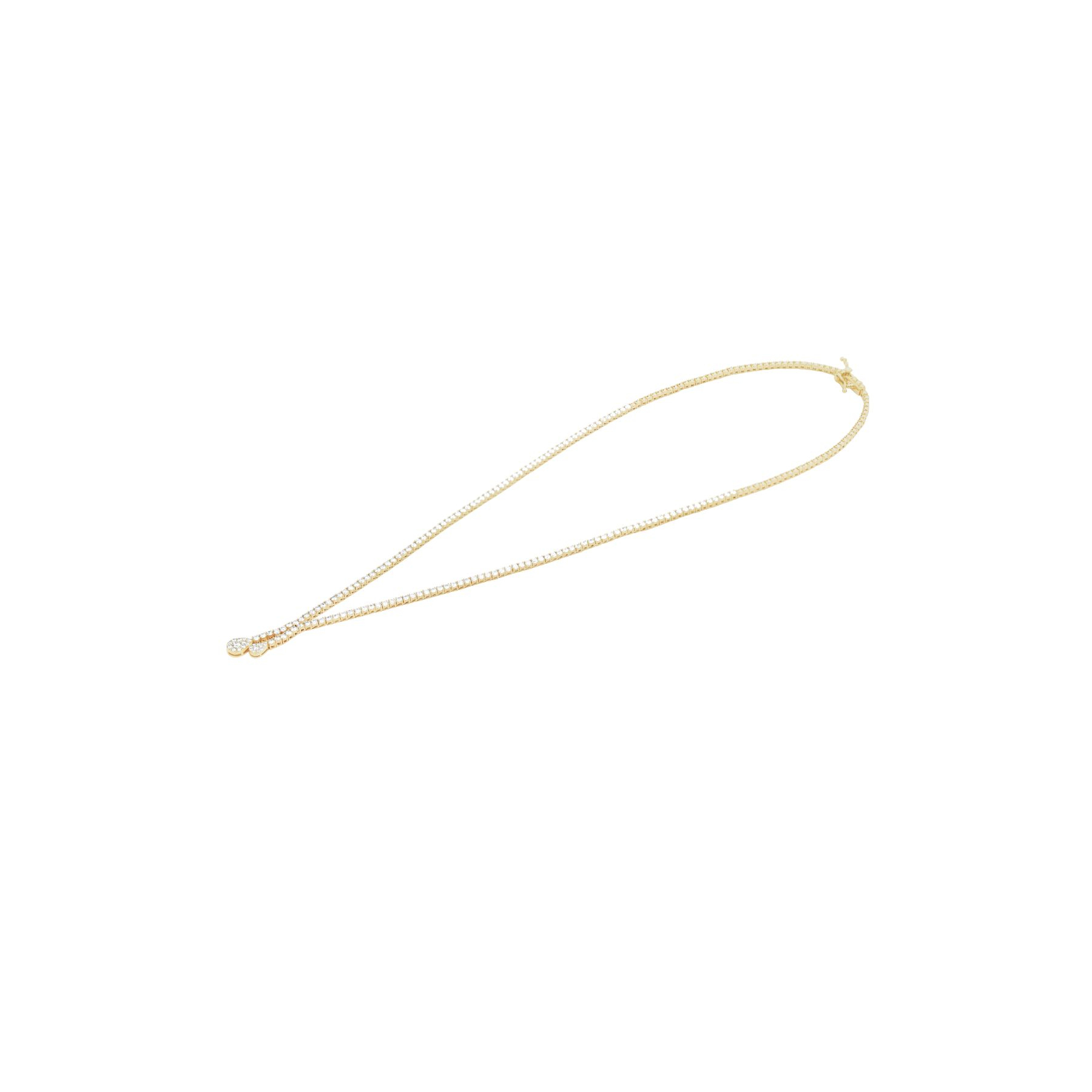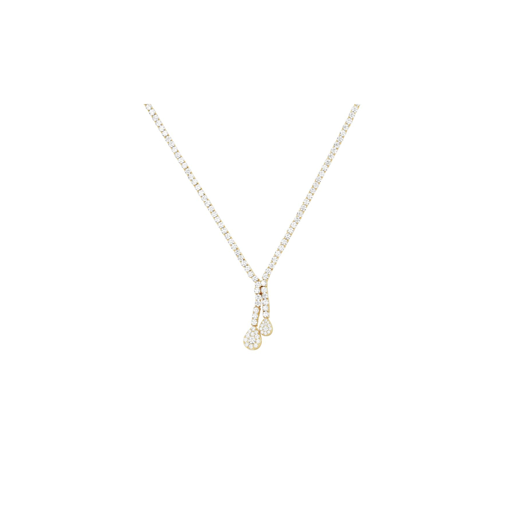 Ce collier en or 750 s’illustre par son design rivière, où les diamants sont alignés de façon fluide sur l’ensemble de la chaîne. Chaque pierre reflète la lumière avec intensité, créant un jeu de brillance continue qui attire le regard. En point d’orgue, deux poires pendantes viennent ajouter un détail précieux et élégant à l’ensemble, accentuant le raffinement de ce bijou de luxe.