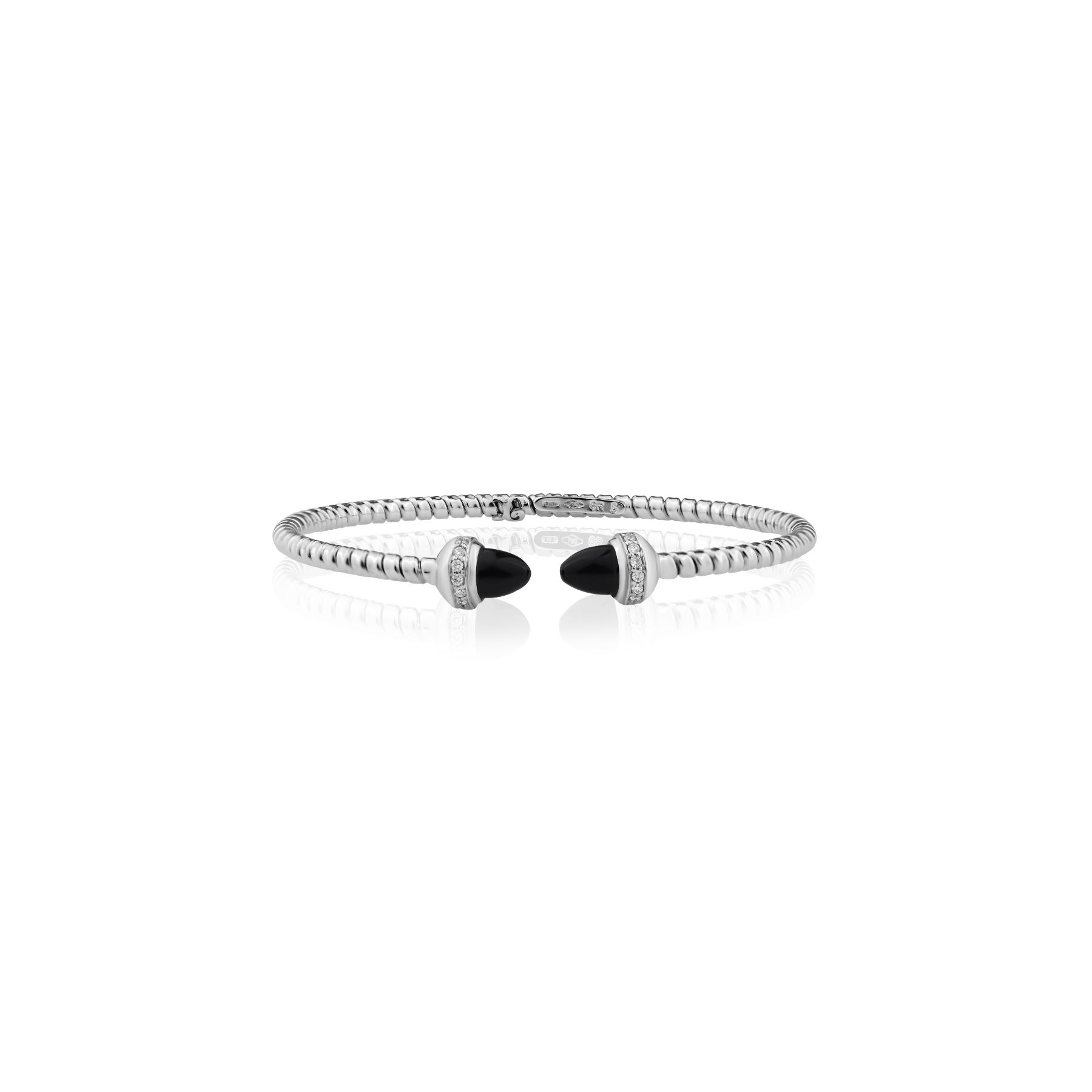 Bracelet spirale arrondie en Or gris 750/1000, serti de diamants taille brillant pour 0,12 ct, orné d'un Onyx cabochon de forme conique. Epaisseur du bracelet 2,80 mm. Diamètre 53 x 45 mm.