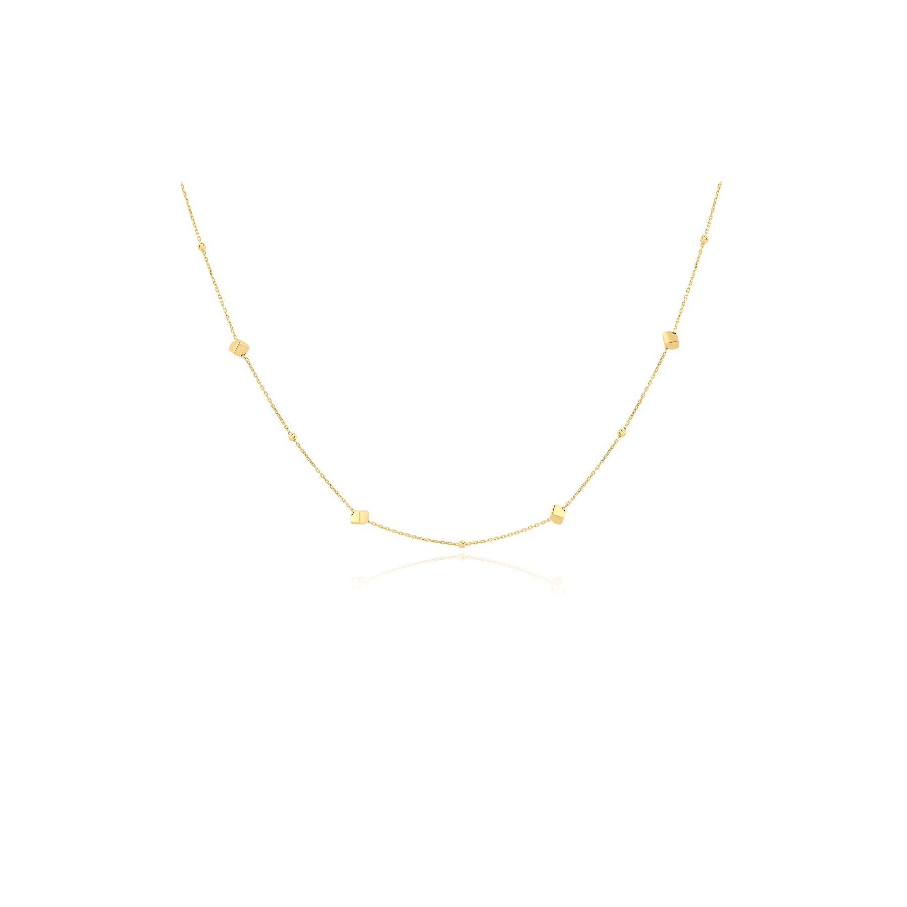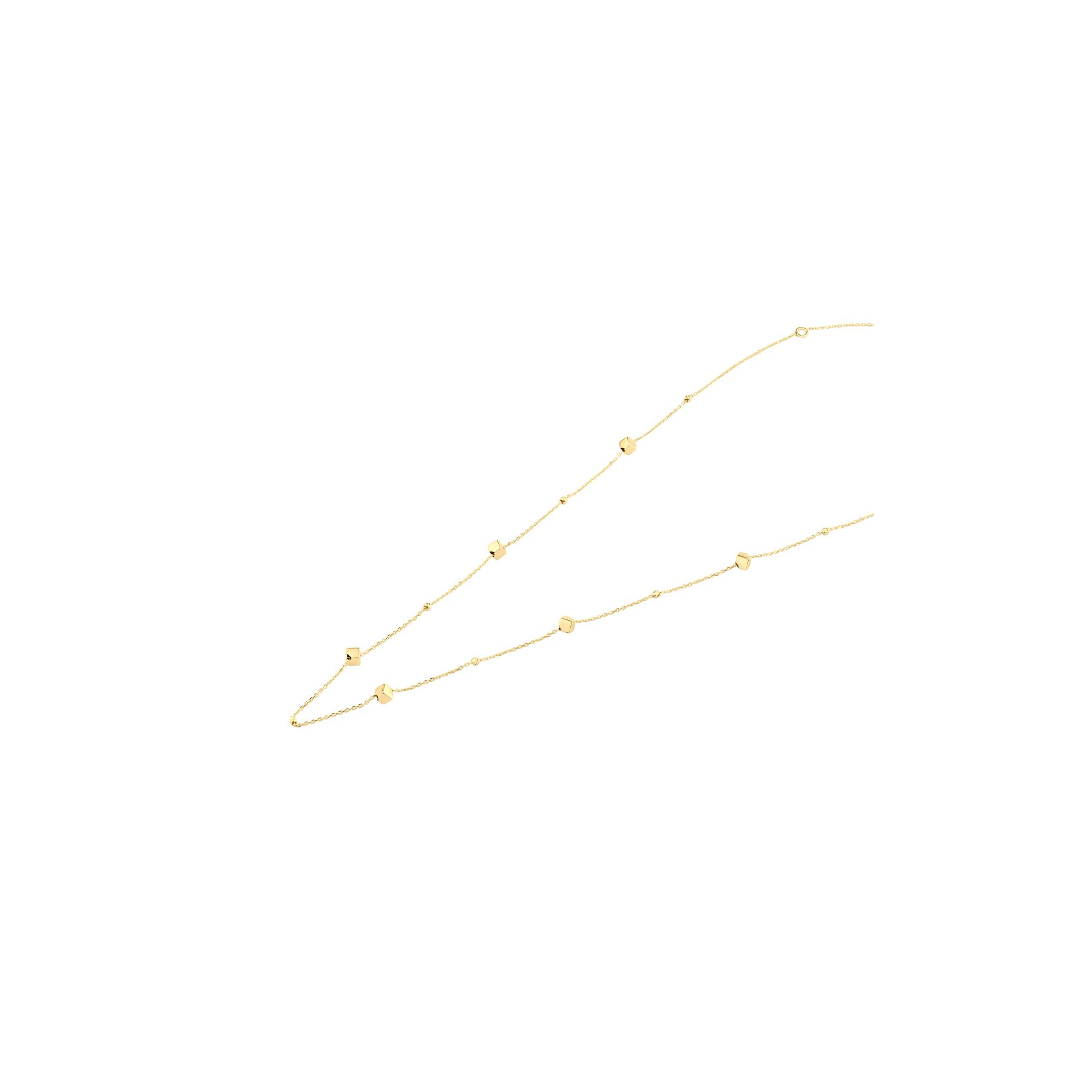 Ce collier en or jaune 750/1000 mesure entre 420 mm et 450 mm de long, avec une chaîne ajustable pour s'adapter à différentes morphologies et styles. Sa longueur permet de le porter avec confort tout en offrant une présentation subtile de ses éléments cubiques et sphériques. Ce bijou se distingue par sa simplicité sophistiquée, qui le rend polyvalent pour toutes les occasions, qu’elles soient quotidiennes ou plus formelles.