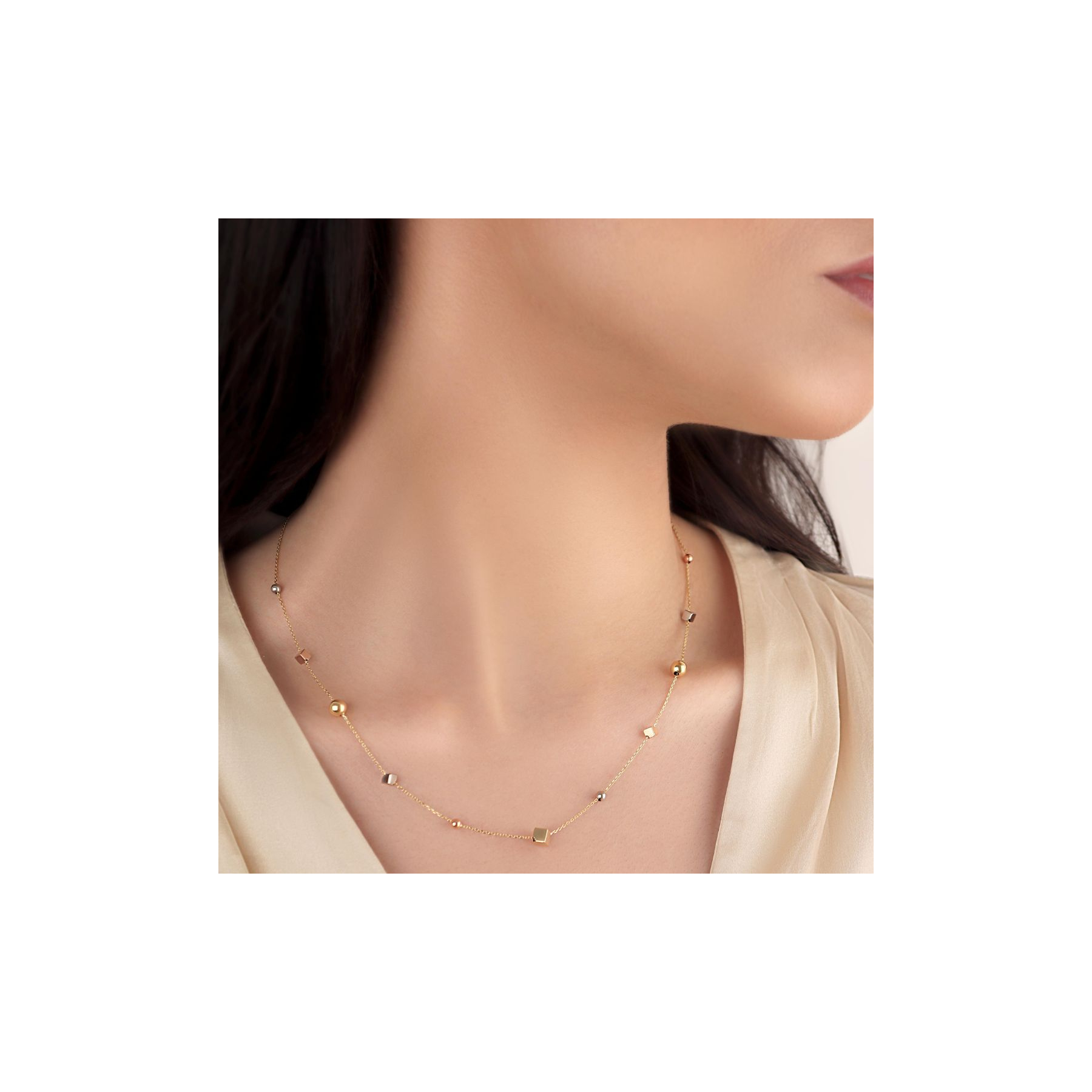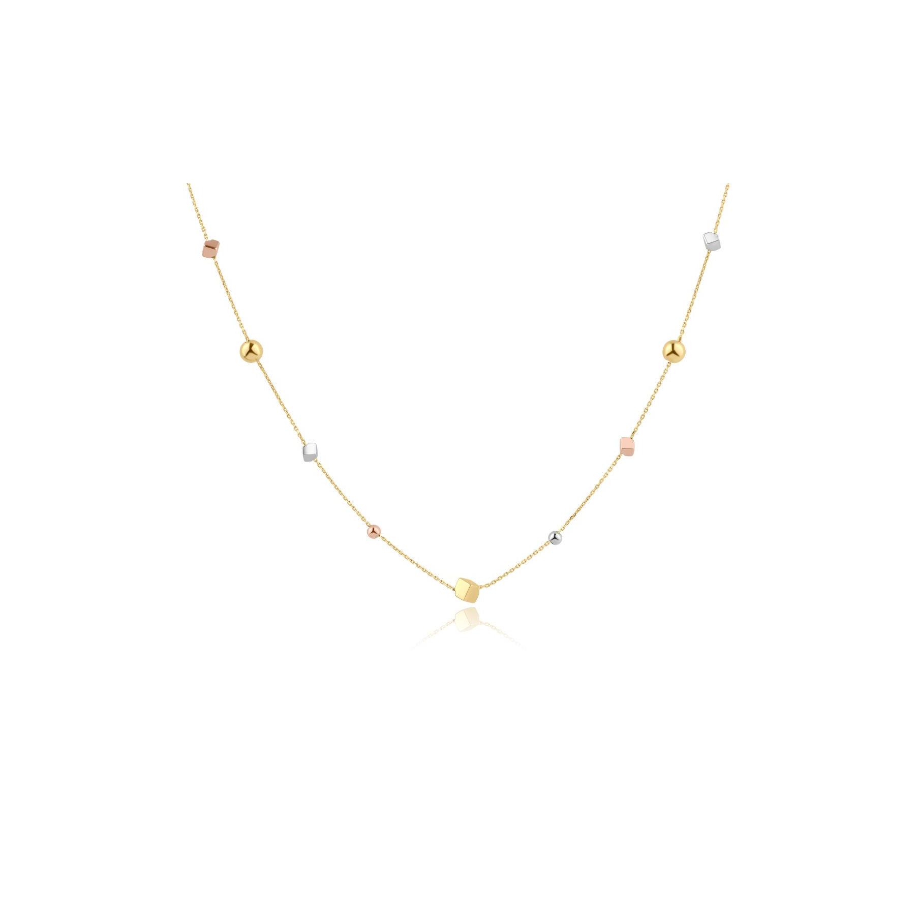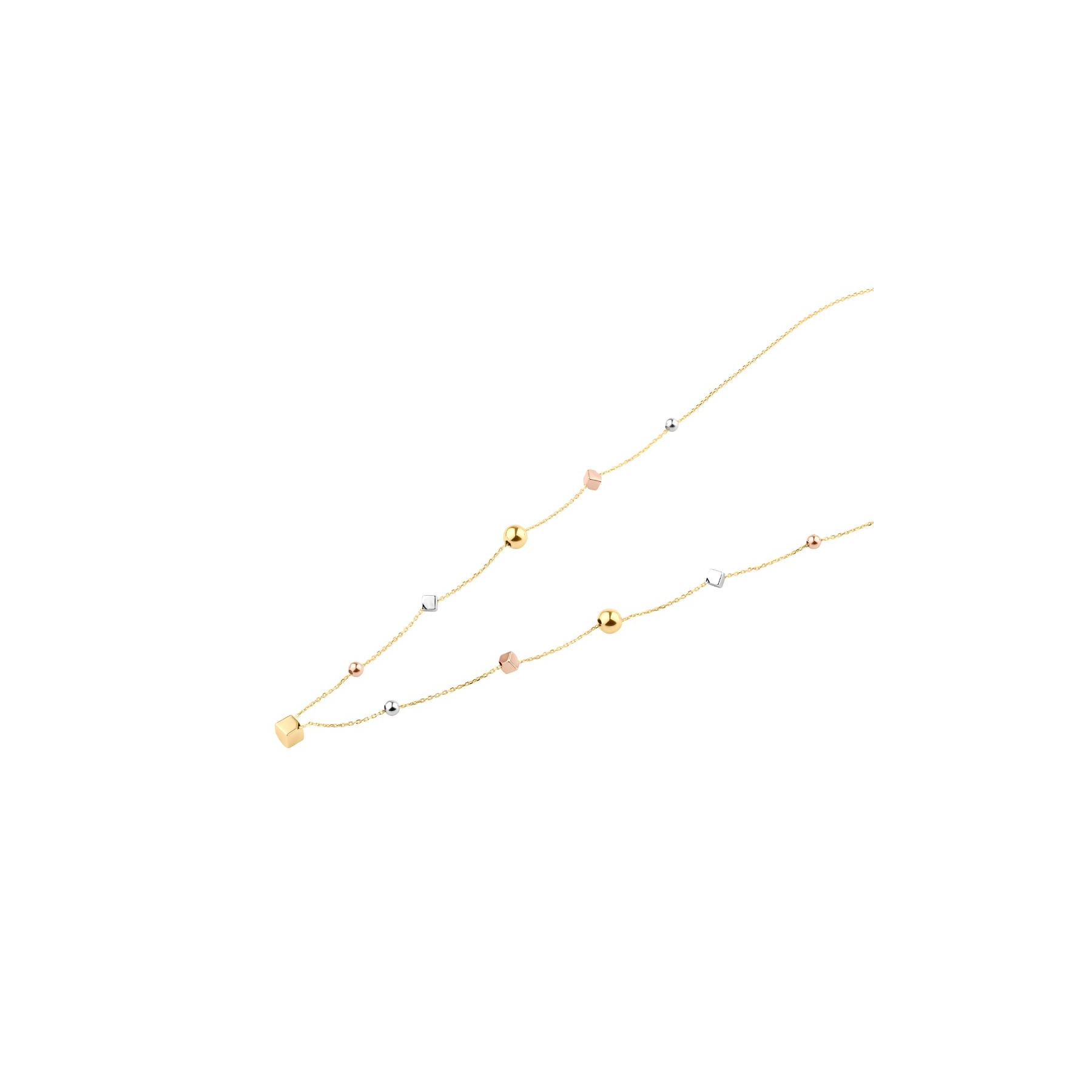La finition du Collier Excellence Or tricolore reflète le souci du détail et la qualité de fabrication. Les cubes et boules apportent de la dimension et du mouvement, tandis que l'or tricolore crée un jeu subtil de reflets qui capte la lumière à chaque mouvement. Ce collier est une véritable déclaration de style, alliant la beauté du métal précieux à une structure moderne et dynamique.