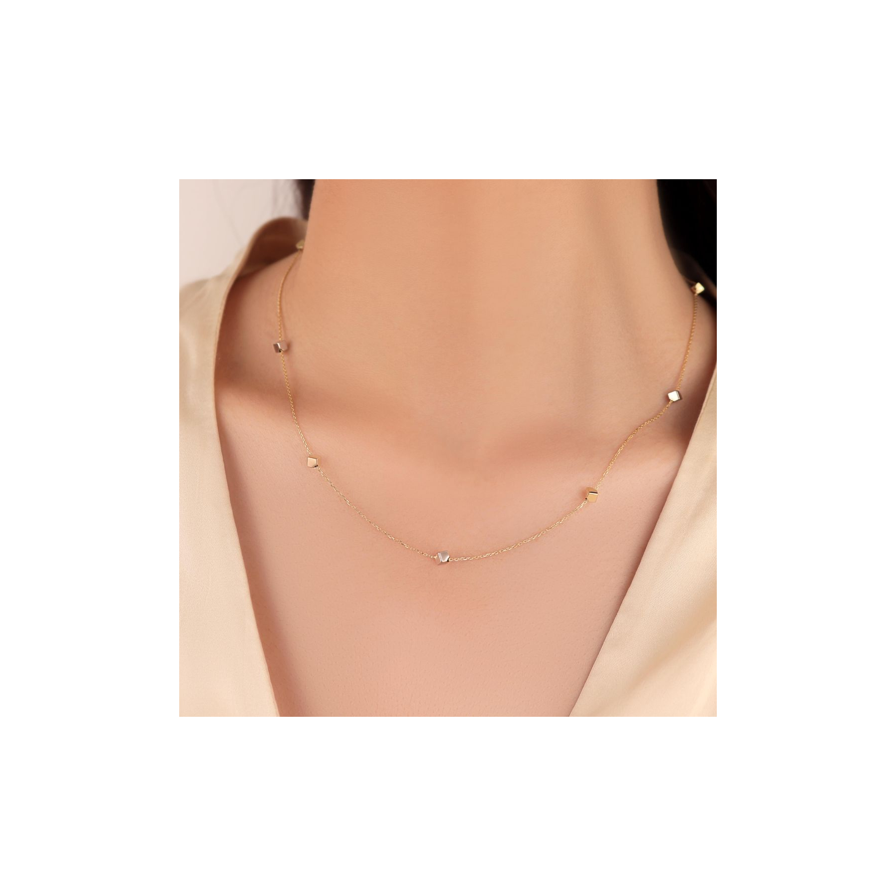L'originalité de ce collier réside dans son design unique, orné de cubes qui apportent une touche contemporaine à l'ensemble. Chaque cube est soigneusement sculpté pour refléter une lumière subtile et donner au bijou un éclat élégant. La longueur de la chaîne varie entre 420 mm et 450 mm, offrant un ajustement parfait pour s'adapter à tous les styles et occasions.