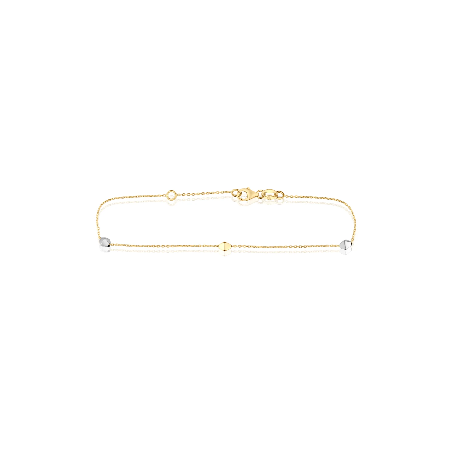Ornée de cubes aux formes octaèdres, cette gourmette offre un style original et contemporain. Les volumes travaillés apportent du relief à l'ensemble, tout en captant subtilement la lumière. Le jeu de contrastes entre les deux ors souligne chaque détail du bijou, renforçant son identité visuelle forte.