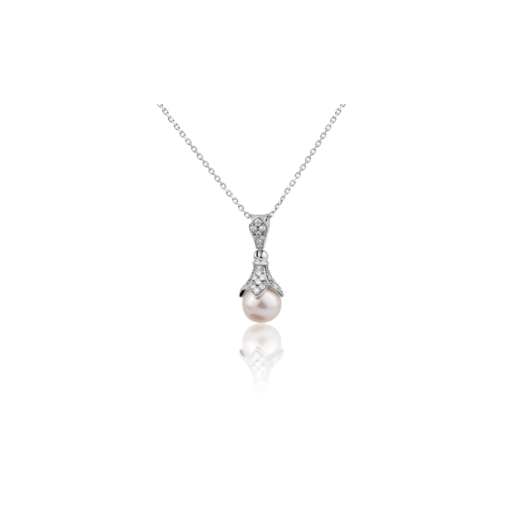 Pendentif excellence Or gris 750/1000, serti de 32 diamants taille brillant pour 0,31ct, orné d'une perle de culture d'un diamètre de 11 mm.