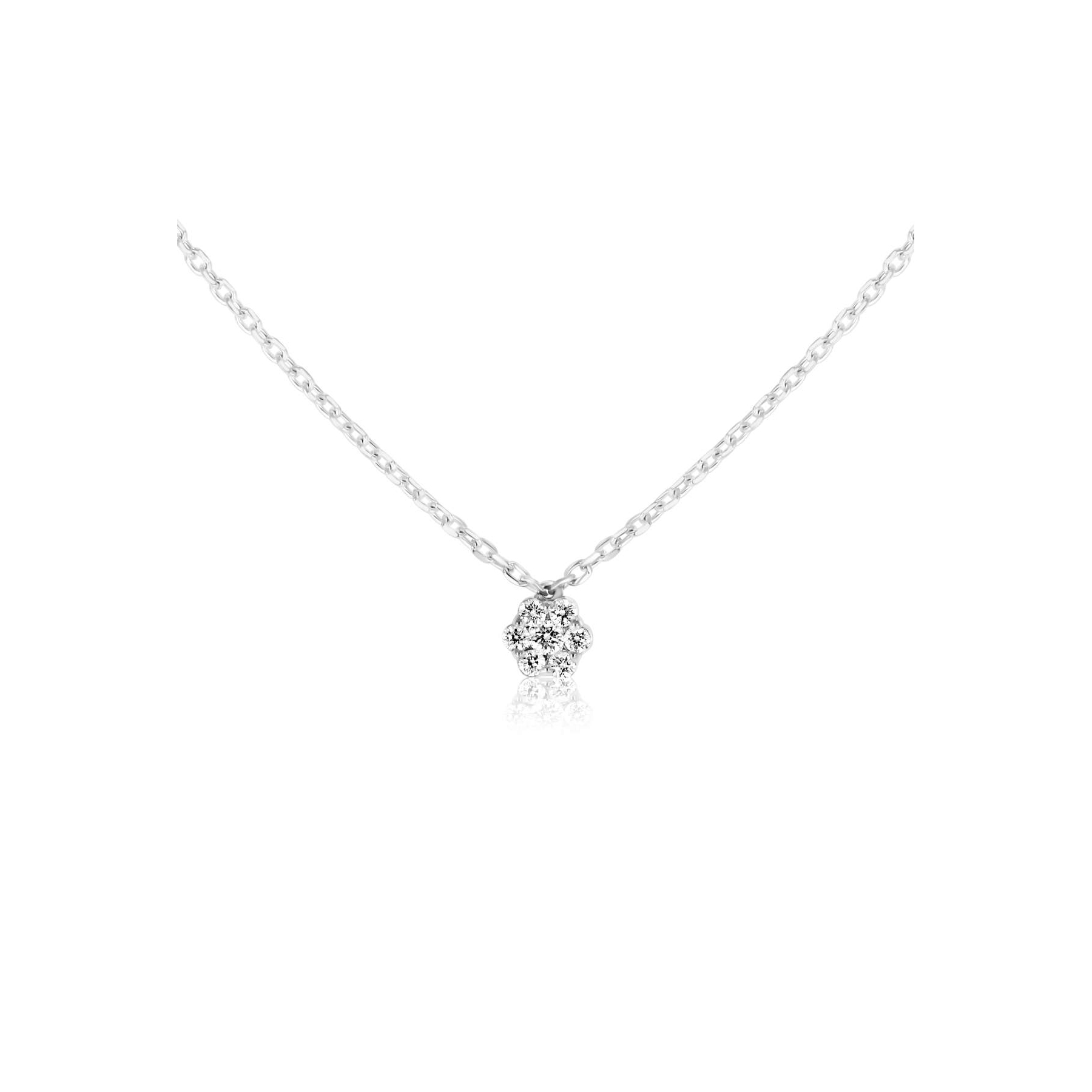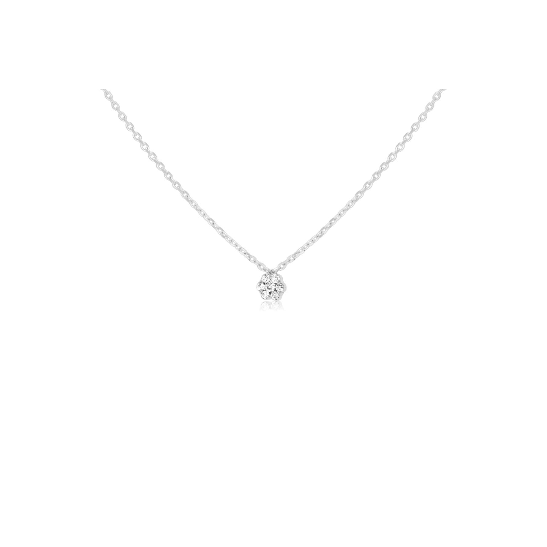 Le pendentif en forme de marguerite est serti de diamants taille brillant pour un total de 0,10 ct, apportant un éclat discret et raffiné à l’ensemble. Ce bijou marguerite évoque la douceur, la féminité et la légèreté, tout en conservant un caractère intemporel. La longueur réglable de la chaîne, de 430 à 450 mm, permet un port ajusté, parfait pour épouser le creux du cou avec élégance.